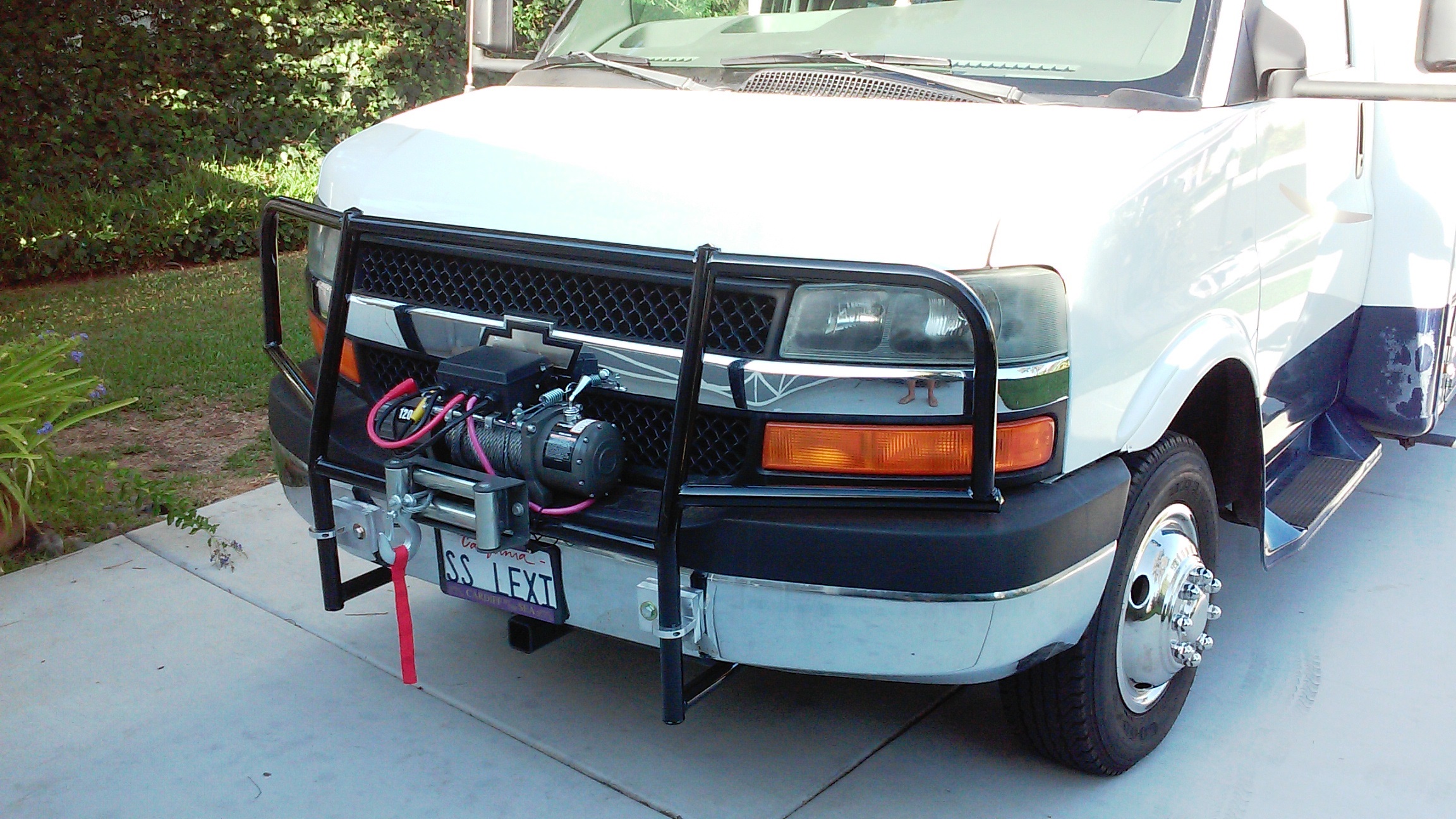 When I came to pick it up, the RV was definitely up there, probably 4″” all around. The profile looks pretty cool. The bar had also been installed on the front. It looked o.k. A little lower on one side but not that you’d notice without looking closely but the winch is tight up against the grill. The wiring was all run to the front as there is no room to set it up on the back side where it would normally go.