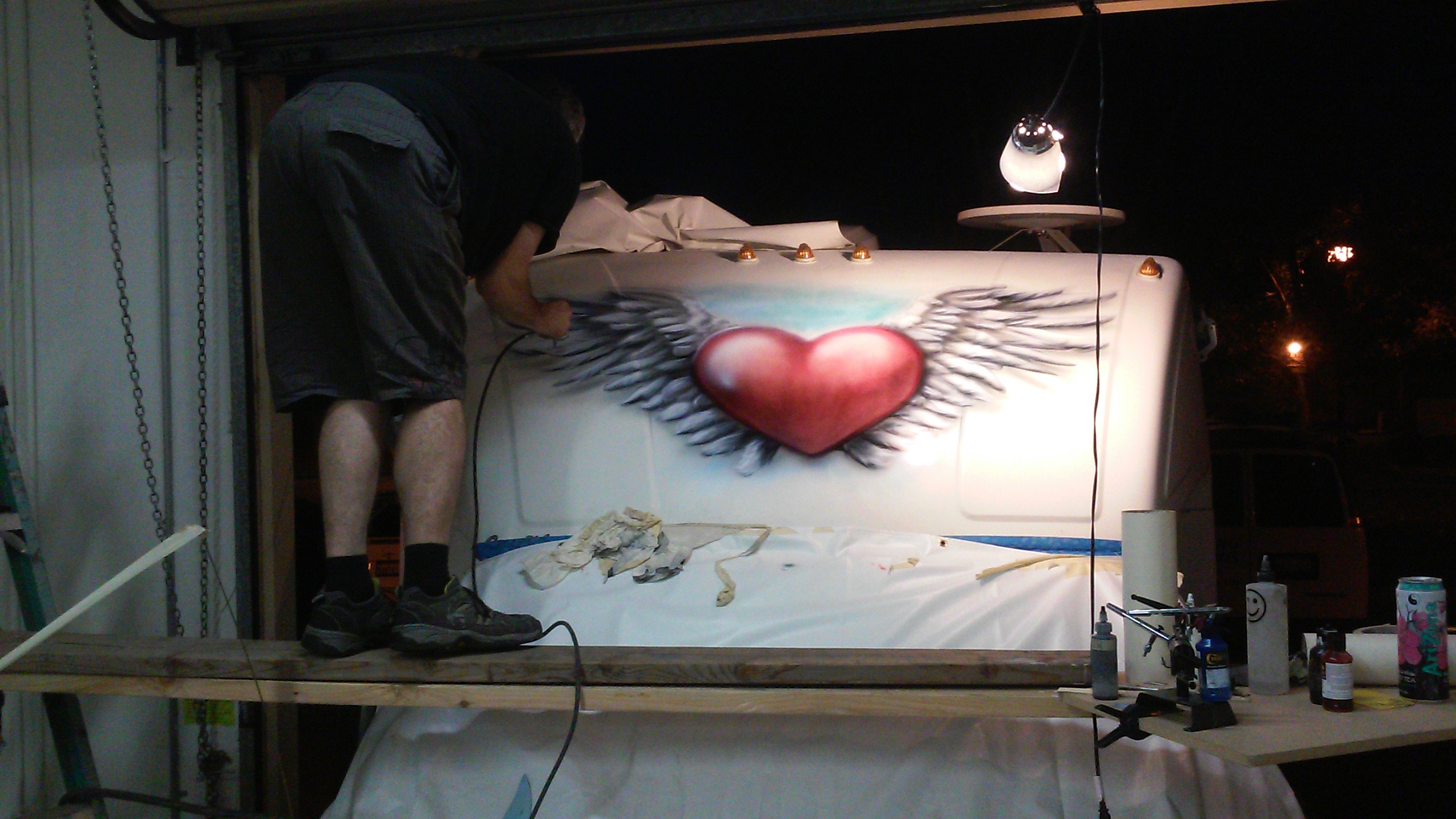 We searched around for an artist and were led to Mark over at Airbrush-Artism in Oceanside. We went over to his shop in the valley and dropped off the RV. We had our basic concept and a couple of images but basically put the project in Mark’s hands and told him to be free with what he thought would look best. He spent an entire day up on a little makeshift scaffolding spraying paint until well after the sun went down. We returned to pick it up in the evening and PJ had him make a few adjustments. 20150628_203759The finished product is what you see. The birth of ‘Heart on the Wing’ as our heart prepares to take flight in the unknown horizon of the future.