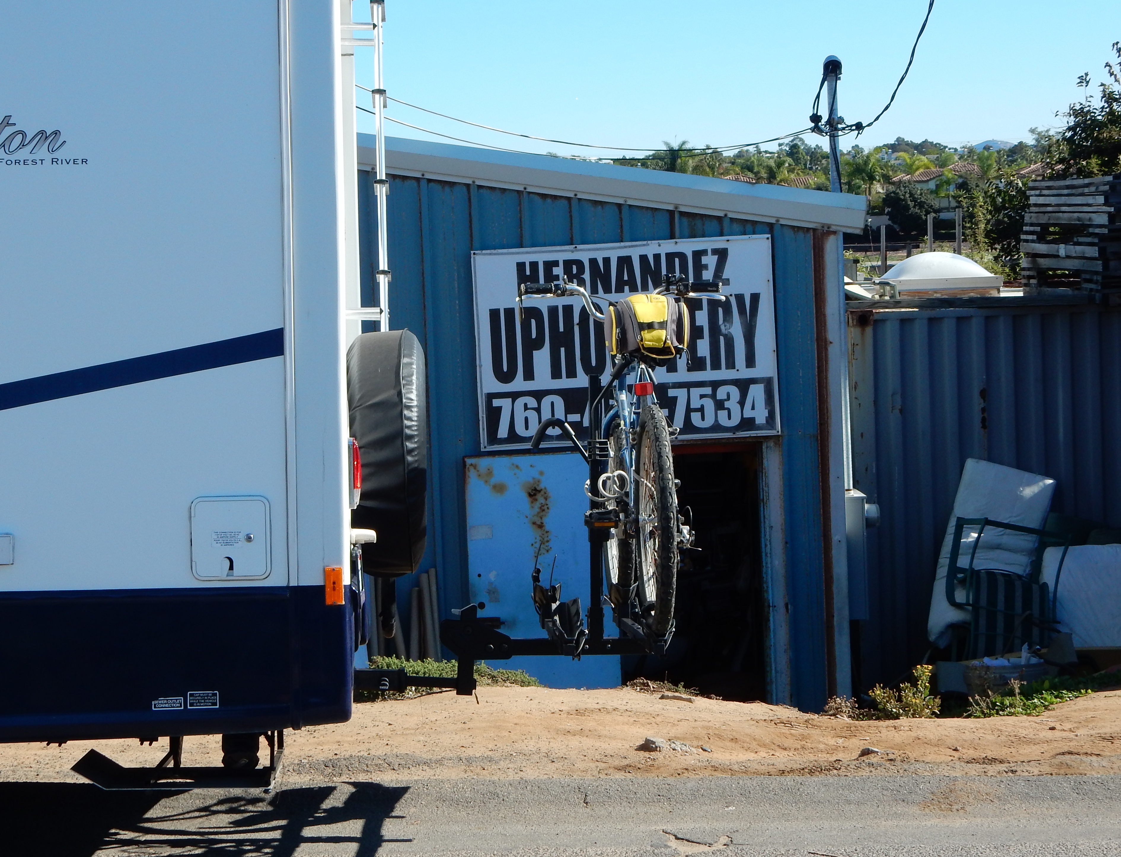 I got up early this morning preparing to take Lexi the motorhome over to Hernandez Upholstery to get a new headliner installed and have the seams that had come undone on the couch resewn. First I swung by Big-O tires because I was having trouble getting my gauge to work on the extenders for the rear. The inside dually tire on the drivers side seems to be bleeding air. Seems like I was there forever getting the tire removed and checked for leaks. The kid was making me nervous jacking up the RV on the u-bolt rather than on the axle, but got out of there with no apparent damage. We determined it was the valve extender, so I just had it removed. Hernandez upholstery had told me to be there at 9:00 o’clock when they open, so I raced over there arriving at about 9:15 only to be told that Jonas hadn’t gotten there yet. He had decided to go home to Tijuana the night before and was still driving up.