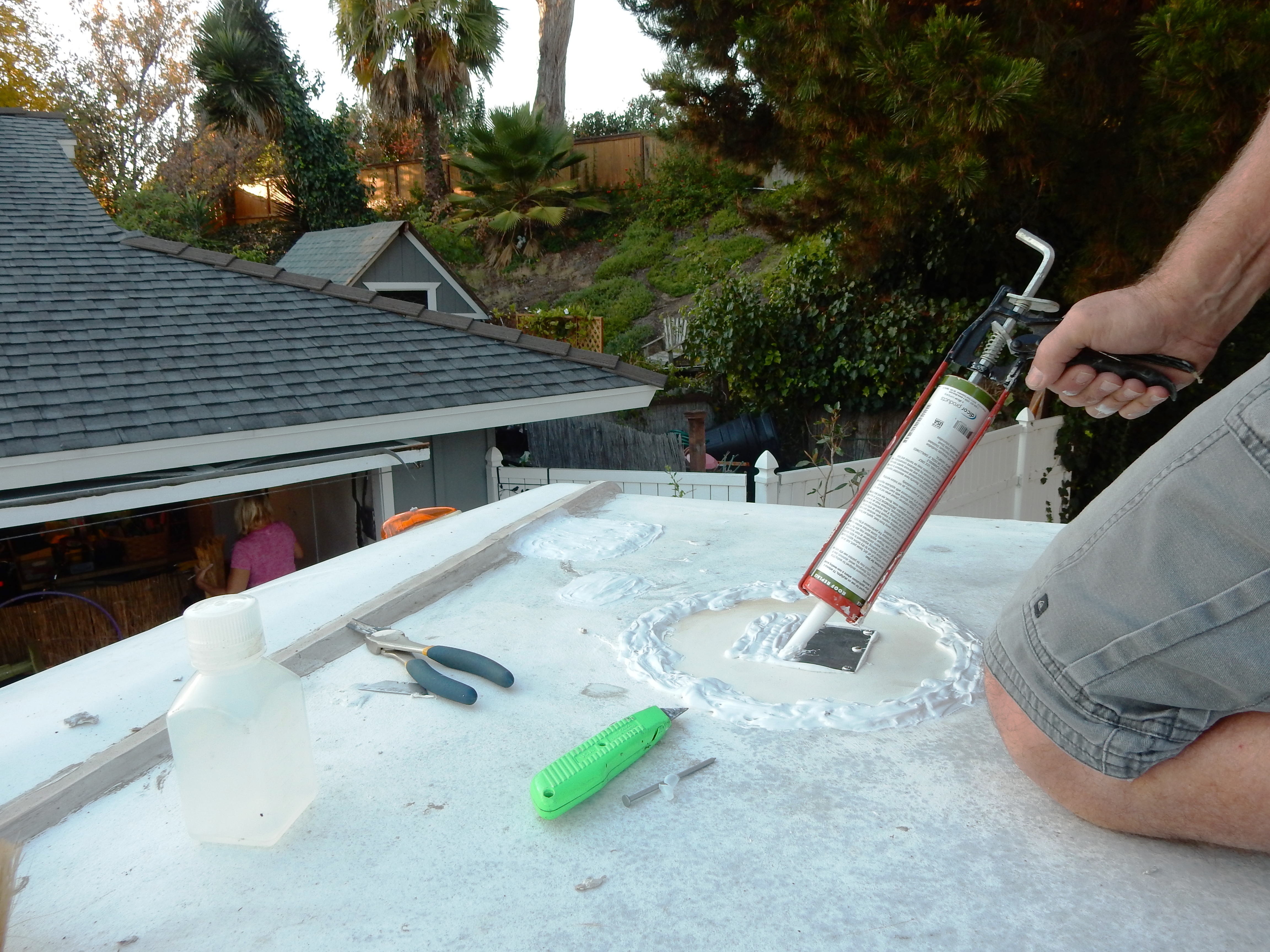 The general consensus seemed to be to leave it as is and not cut away the sealant or disturb the integrity of the repair. As the sealant cures, the patch will tighten up and stay sealed. So, I added another coat of sealant and then resealed all of the margins on the vents, ladder mounts and seams along the caps.