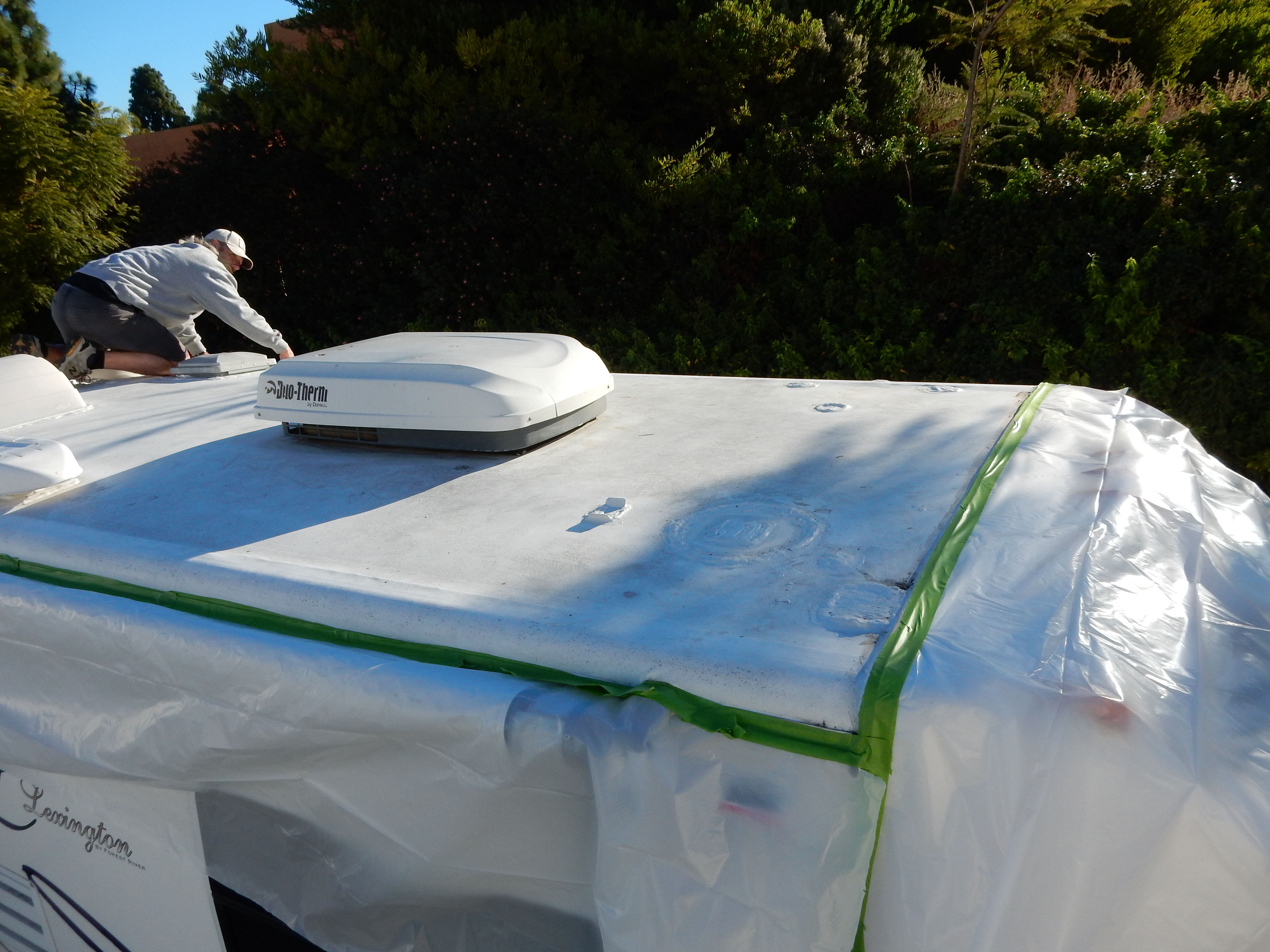 After the water from the power wash had completely dried, I loaded up my little pump sprayer and coated the roof with the part 1 cleaner/preparation solution from the Coolcoat kit. After leaving it on for 30 minutes, I climbed up and power washed it off nearly blowing myself off the roof in the process. Now, there was more wait time as the roof has to thoroughly dry before painting on the Coolcoat. I amused myself working on other little projects inside the RV.