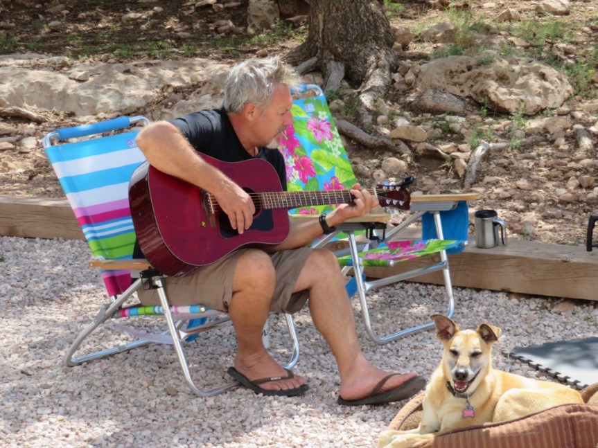 We broke out my guitar and the little djembe drum and gave an honest effort to drown out the gas powered weed whacker in the background. PJ pounded out a beat and I played what few songs I know how to play.