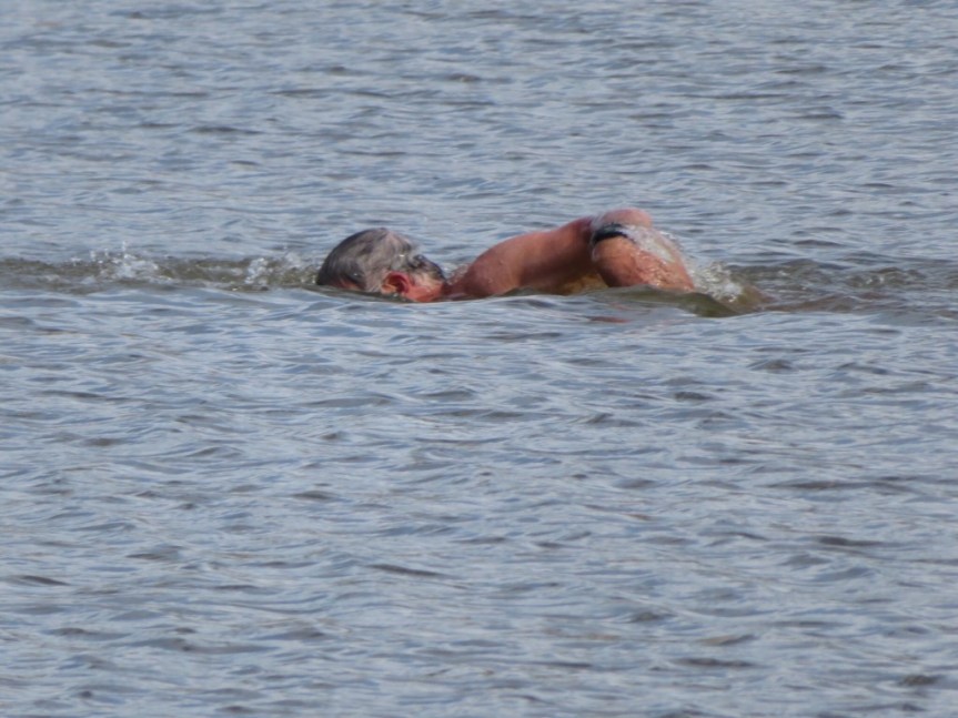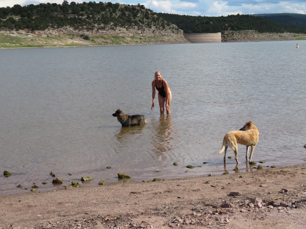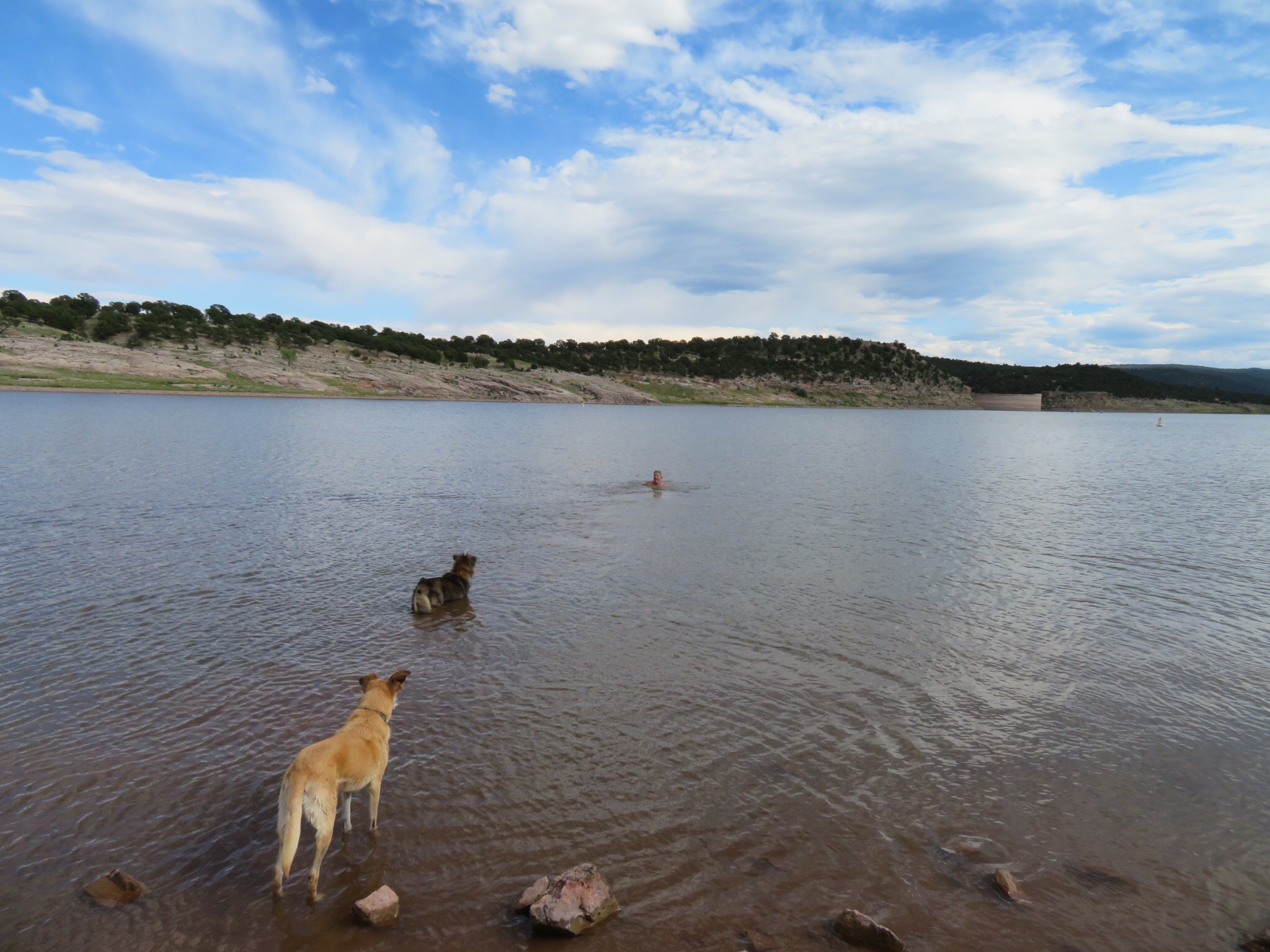 The sun finally made an appearance so it was time to take the pups down for a swim in the lake. We walked down the hill and put our toes on the water. Not too bad, maybe high 60s. We all went in, the dogs up to their bellies and PJ and I for a little swim.