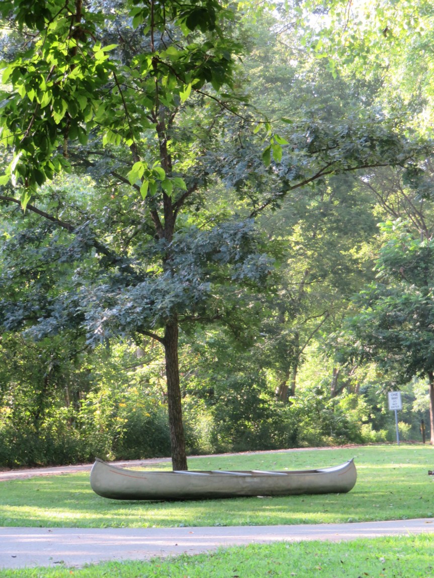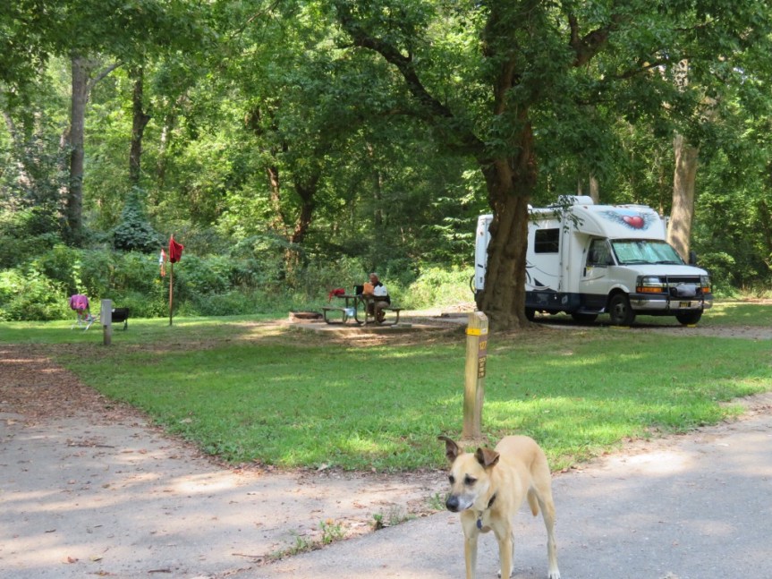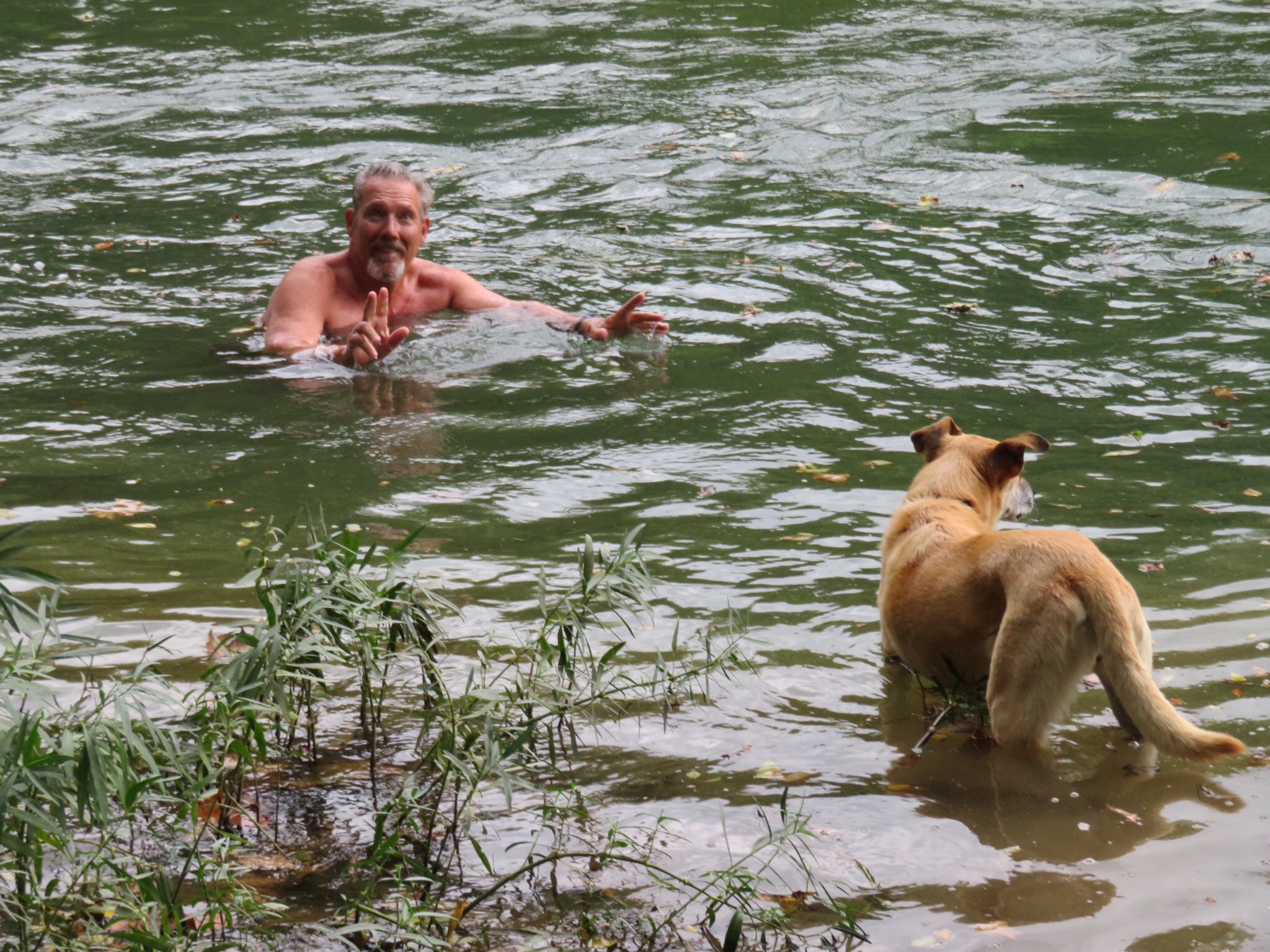 We started our morning with a hike down the trail that runs behind the camp site. It didn’t go too far which was good because every 10 feet or so, there was a spider web to negotiate. The river entry at the end wasn’t as good as the ones closer to camp. We enjoyed breakfast at the picnic table then climbed down the bank in front of our site and had a quick swim in the shallow water. Afterwards, we took the dogs for a long walk around the grassy campground. When we got to the river access near the cat lady’s campsite, we hiked down the steep slope and let the dogs have another swim. The heat was already rising and the humidity feels like Hawaii.