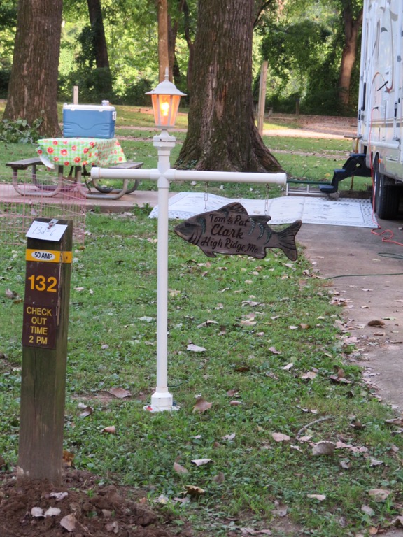 The rain came down, so we hung out inside reading and looking at photos. Some new campers showed up and set up their large trailers about 5 sites down backing up against the forest like we are. Three trailers, appears to be a group of friends camping together. Another couple from Minnesota set up their Tioga down by the riverfront where the cat lady had been.The rain finally abated and we were itching to get outside. We walked the long loop past the check in kiosk and the bat cave. At the far end of the park near the playground, there are a few more people. Seems to be popular because of the amenities for the kids. When we got home, we fed the dogs then I cooked us up some Soyrizo and eggs and we ate it outside at the table watching the neighbors set up. One couple had their own little signpost with their address like plaque on it set out front like a mailbox. Pretty cute idea.