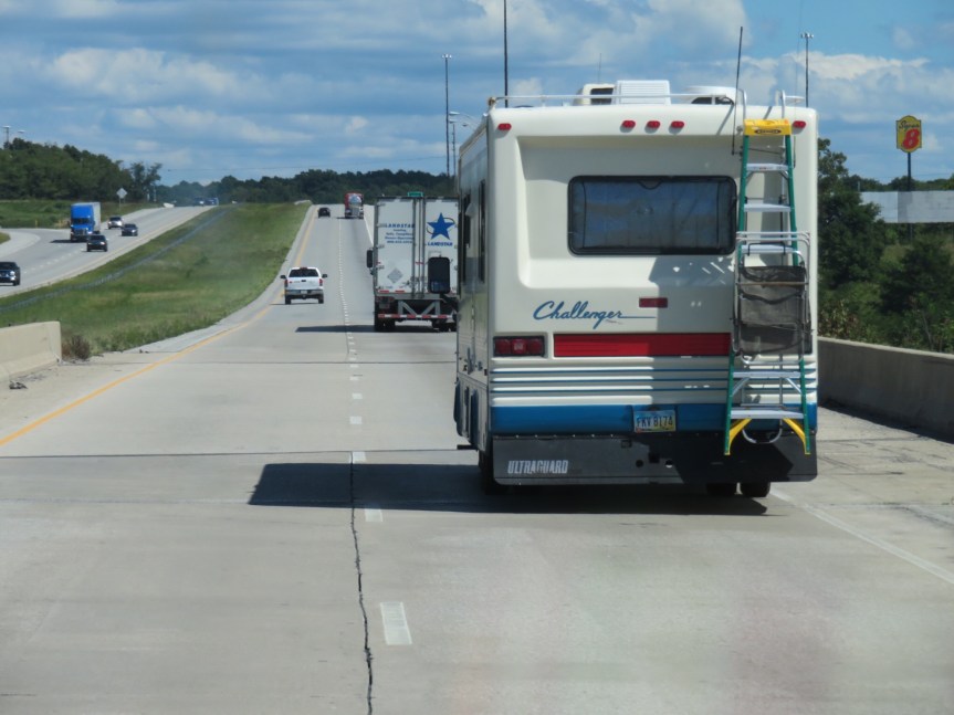 We left Wolf Creek about 10:00 this morning and backtracked our way through Straussberg and the surrounding farmlands. Made a stop in Effingham for more dog food and a few supplies then got back on the I-70 heading into Indiana. Made a few rest stops, but mostly just a solid day of driving. I actually had a treat just after Indianapolis – I passed another motorhome! My only passing of a vehicle in a week.