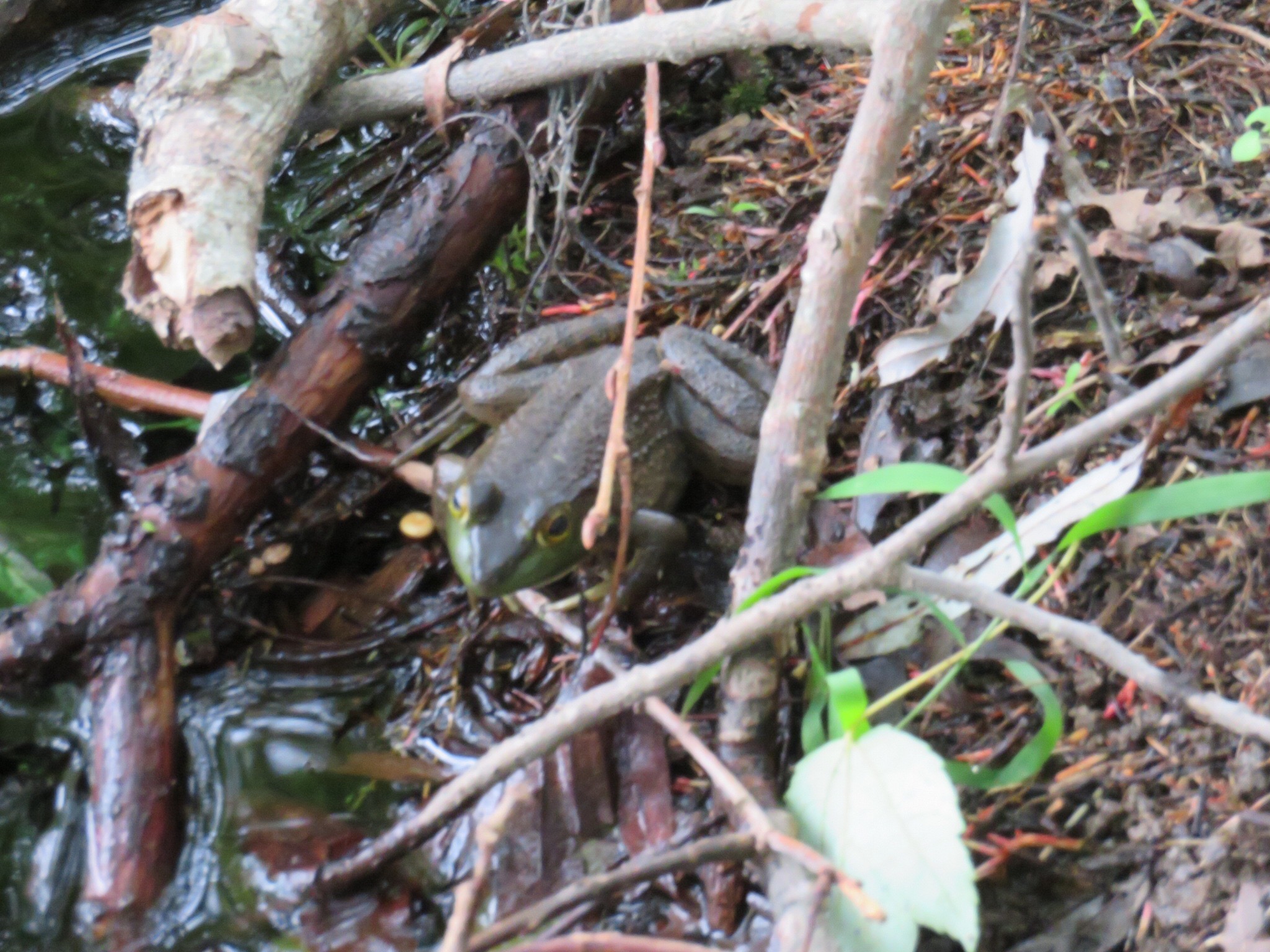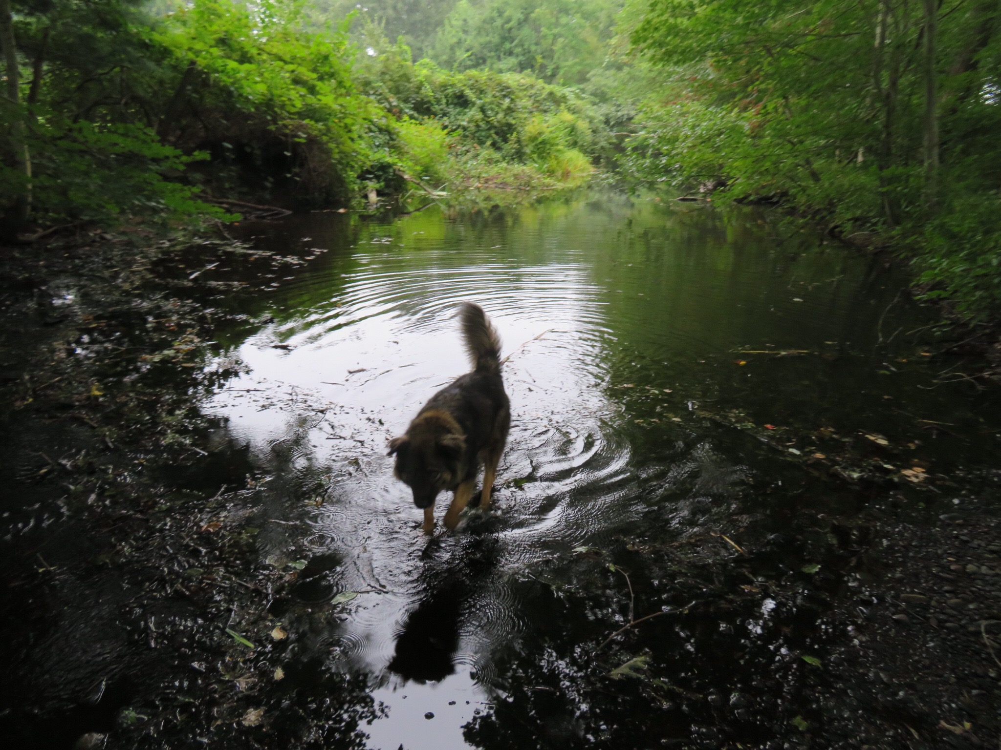 We started our day with a hike back by the little pond in the woods behind the camp. Koda was happy to find a spot where she could get into the water and have a little swim. There were lots of little frogs hanging around on the bank and the water striders were skating across the calm, glassy surface of the pool. The dogs ran through the open grassy area and Koda rolled in the wet grass, smiling as she played.