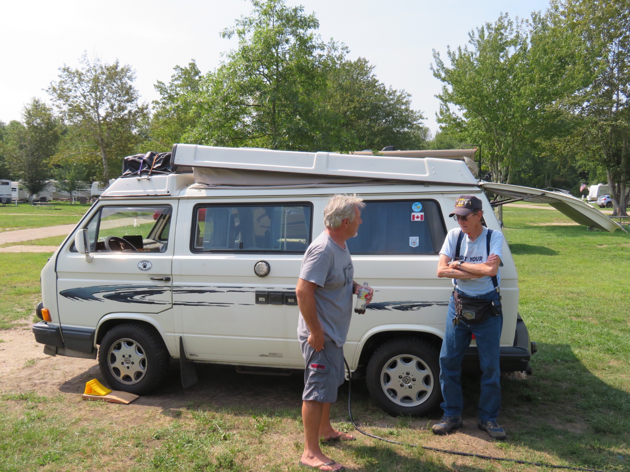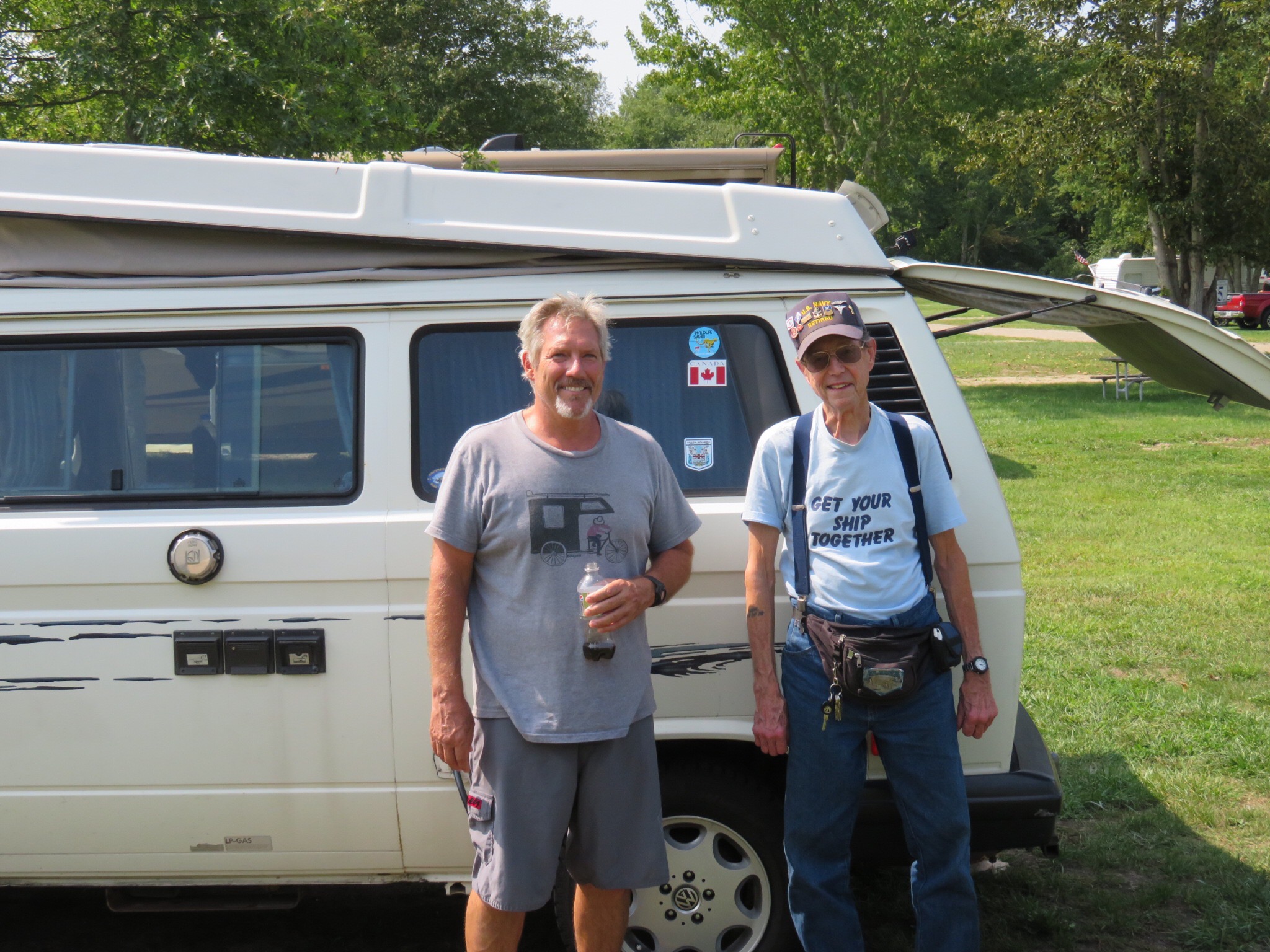 We had a late breakfast and rolled out the awning and relaxed around our campsite. Our neighbor to the back has an old Vanagon and PJ started up a conversation with him. We all hung around for a while talking and checking out his Suburu powered VW. Wynn is 85 years old and drove the Vanagon out here from Oregon along with his little dog to attend a reunion of Navy veterans from the submarine base nearby.