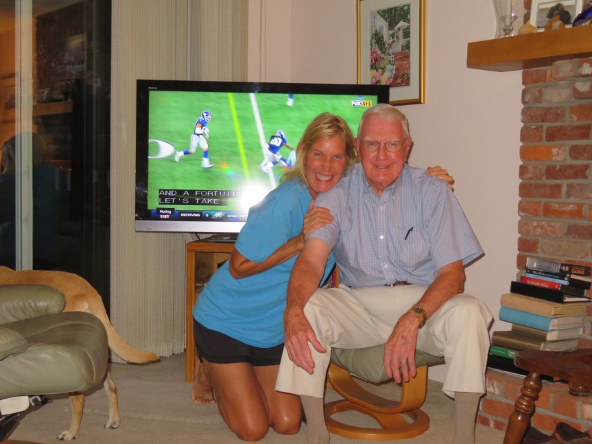I got in a little nap, then PJ’s Aunt Norma and Uncle Clayton arrived. They had come down from New Hampshire to attend a reunion down near Narragansett and they were coming to spend the night before continuing home tomorrow. They arrived just about the same time as the pizza, so we relaxed in the parlor eating pizza and getting the latest family news from them. The conversation and football watching went on until late. Wonderful to be among family and resting in their comfortable home.