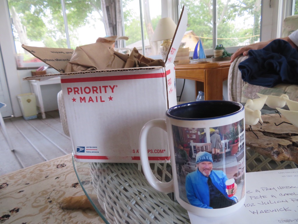 I had a little package waiting for me from Cherokee Park in Ohio. I had inadvertently left my favorite coffee mug that my friend Steve had had made for me a few years ago. I’m sure you’ve seen it in many a blog post with my smiling face sitting at the Lumberyard in Encinitas on the front. Pamela had phoned the kind woman who runs the front office and asked if they’d seen it and she went to our site and discovered it resting on the electric tower. She carefully packed it and mailed it back and there it sat, faithfully waiting to deliver me another hot cup of tea.