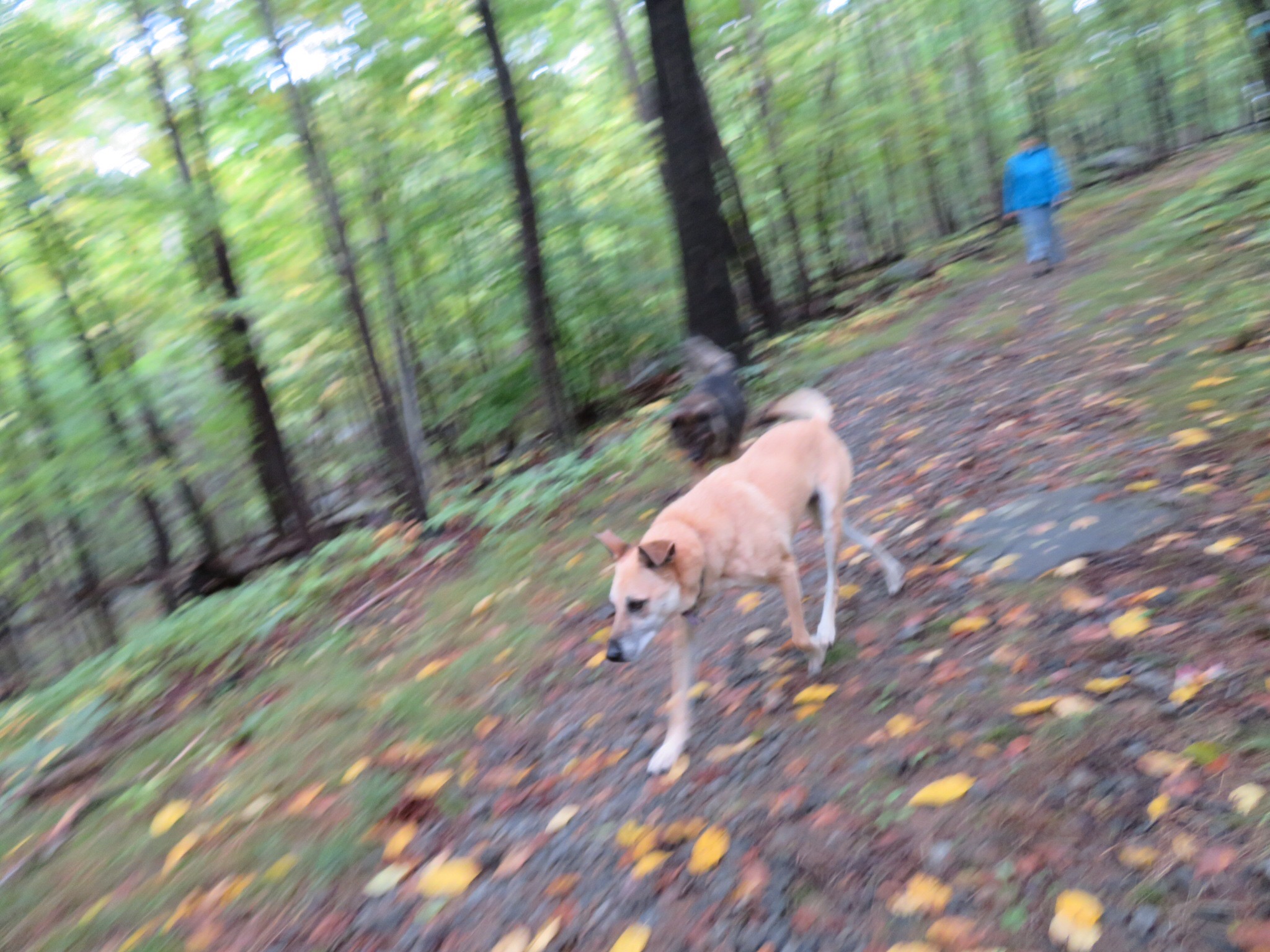 I don’t know if it was the darkness from the tree cover and overcast skies or that she just needed to catch up on some sleep, but PJ slept until after 9:30 this morning. I was up at seven and took the hounds on a 2 mile hike into the forest. They sniffed every bush and did their morning business. We enjoyed the stillness and greenery. The dampness of the place gives rise to all manner of moss, lichens and fungi. The trees are starting to turn and the colors really catch your eye.