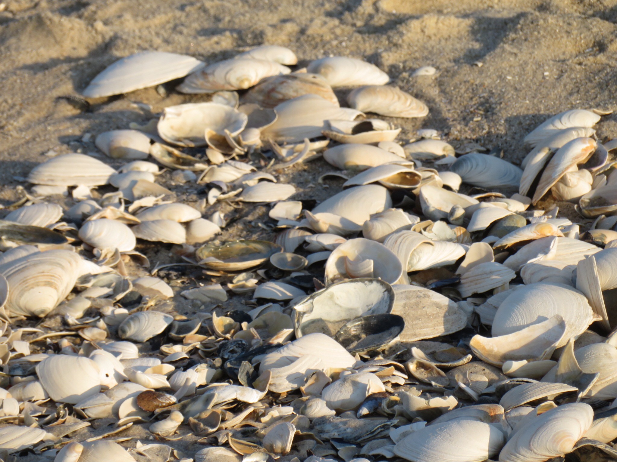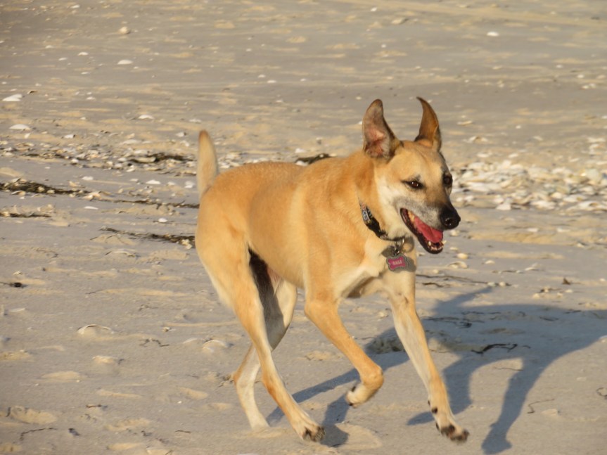 Unleashed the hounds and let them have the run of the beach. Waded in the water and it felt o.k., not exactly tropical but not freezing either. Maybe tomorrow. There were a few bumpy two footers crumbling through, but no one was out. The shadows were getting long so we decided to hunt up some dinner. When we walked back to the RV, we noticed the two leashes we had left to dry on the bikes and realized we had lost our mat. We jumped in the van and retraced our steps, but no doormat to be found. PJ was saddened by her loss, somewhere a Long Beach Islander is enjoying his new nautical mat. We headed back towards camp stopping along the bay to watch the sun drop behind some clouds.