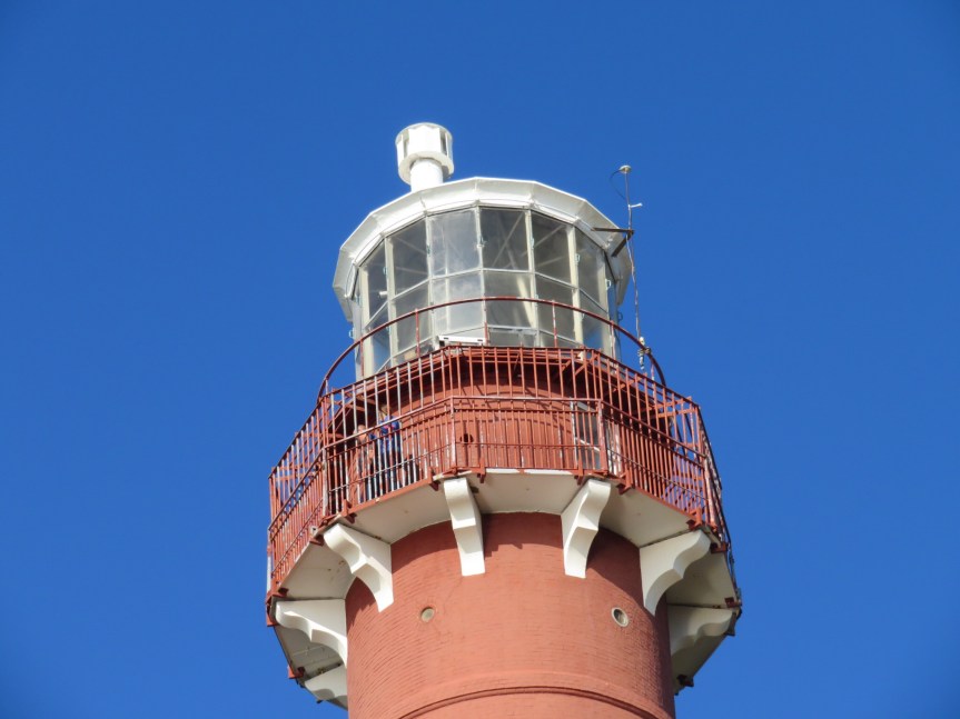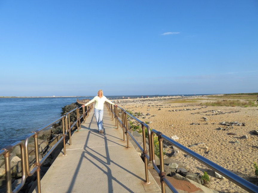 When we got onto the island, we turned left and followed the road down to the end to visit the Barnegat light house. We parked in the lot and discovered that the water bowl had slid off the mat and spilled onto the step with the leashes. We took a few minutes to clean things up and hung PJ’s beloved ‘Let your troubles drift away’ mat on the bikes in back to dry up.