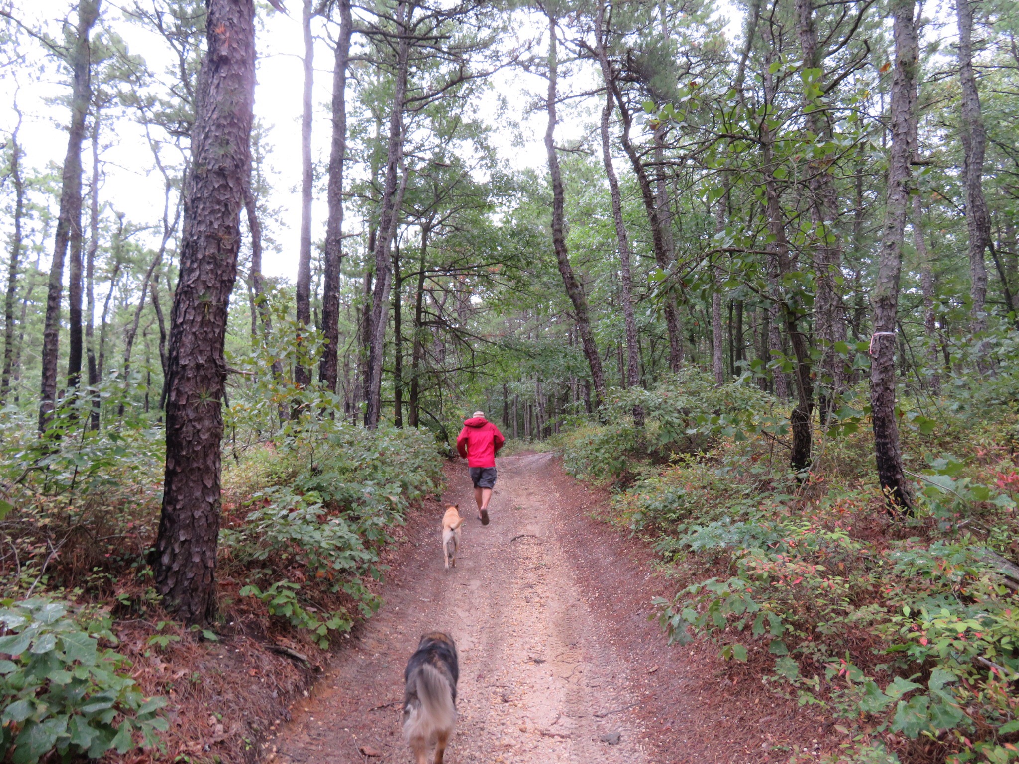 We hiked up a trail in the back side of the property where the mountain bikers had a track set up for racing around with berms on the corners and a jump near the top. Cali did some jumping of her own running circles around the rest of us as she followed the scent of another varmint down the path.