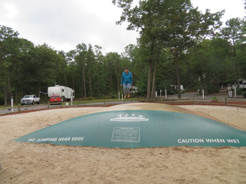 We were getting a little stir crazy, so when the sky was clear we headed out to wander around the camp. PJ had ago on the giant jumpy thing out front, then we strolled into the side of the camp with the long term campers. Some of them had some pretty elaborate decorations going on. A popular addition for many was a little palapa bar for entertaining their friends. The weather was keeping people indoors or they were working or gone for the season, but the benefit for us was having the run of the campground.