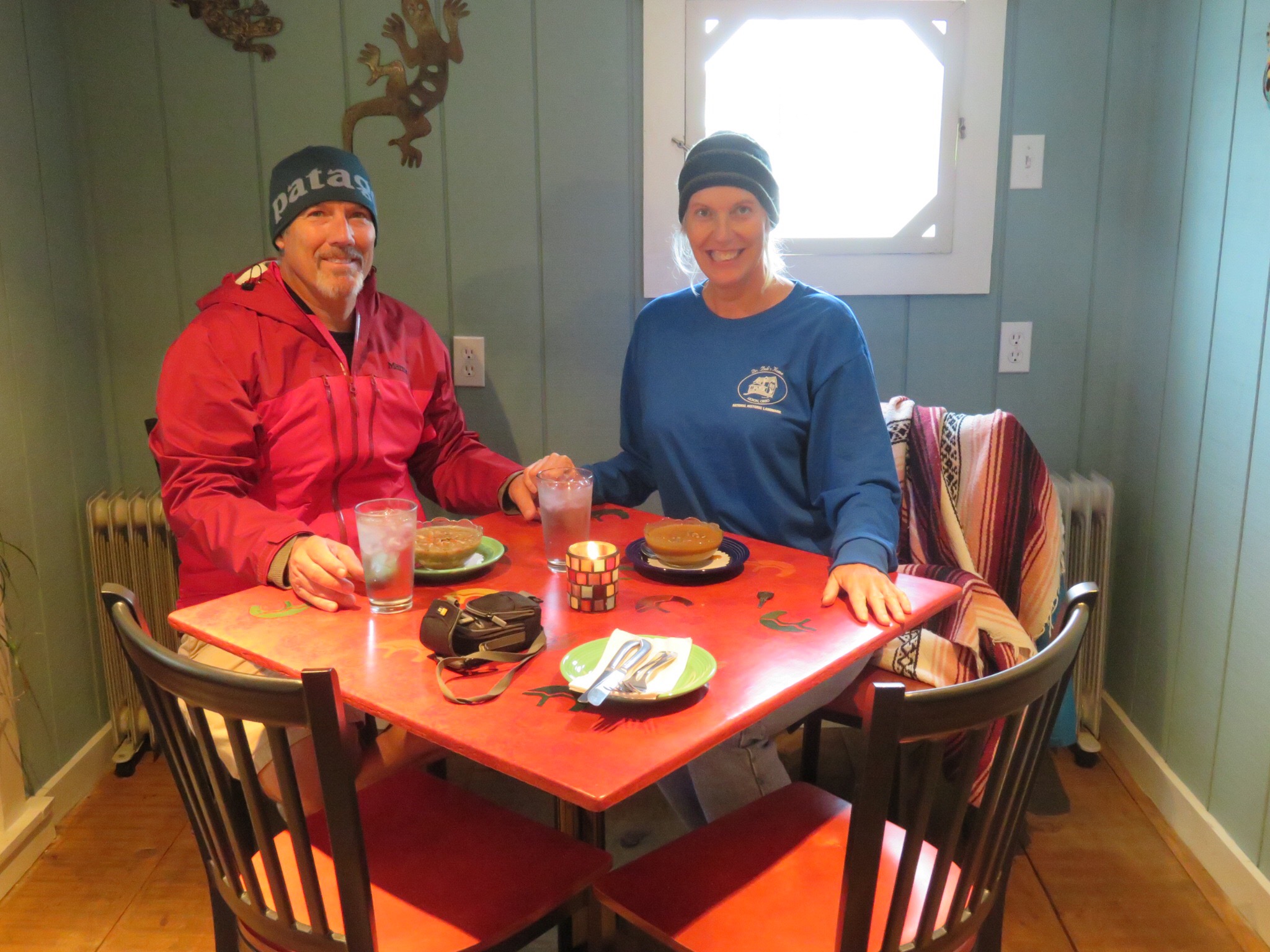Old Victorian houses from the 1800s line the coast road and all of the neighborhoods behind. Some were pretty amazing. We rode down a few side streets and then into the main tourist area complete with walking streets with gift shops and a large choice of dining options. Evening was upon us and we were getting hungry. PJ spotted a little bohemian looking cafe on a quieter side street and we decided to see what they had to offer. Gecko’s West Perry Cafe was an artsy little cafe with windows wide open and a colorful deck area outside. Multi-colored Mexican blankets hung on the back of chairs and waited in baskets along the side for patrons to use in order to ward off the chill.
