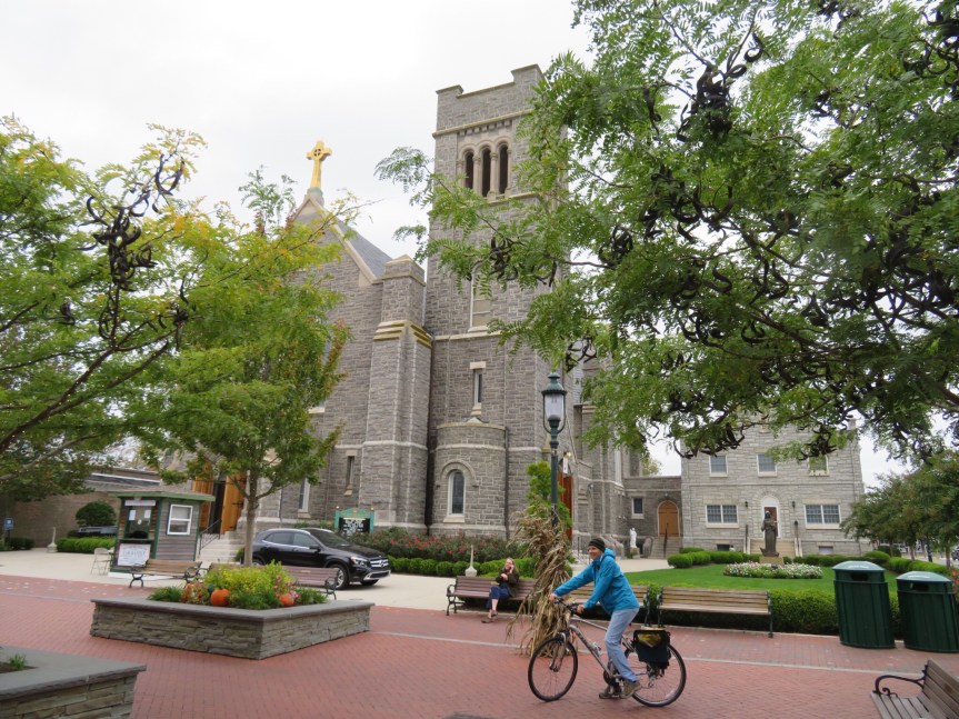 We ordered paninis and soup and were not disappointed. The food was unreal. I had a roasted corn chowder and a Cuban sandwhich while Pam had a veggie panini with butternut squash soup. The sandwiches came with a German red cabbage and carrot salad. We huddled together and tried each other’s fare. The servings were large and we had to leave a bit behind so we’d be able to ride back to camp.