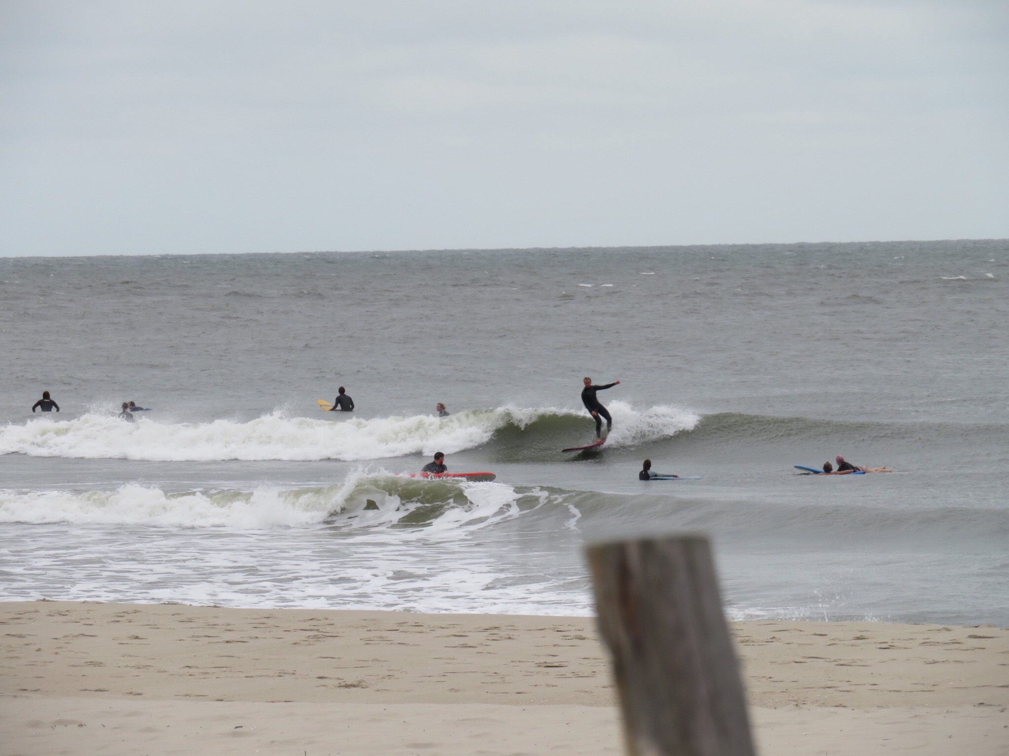 When we reached the beach, we rode our bikes along the boardwalk. Even though it was a gray afternoon, there were a few hardy tourists and locals walking along the sand. A group of surfers were milking what they could from the small sets that would roll through along the jetty to the north. Children were building sand castles down near the inlet and young couples were snuggling on benches by the pavilion. As usual, we took way too many photos but were having fun trying to get creative.