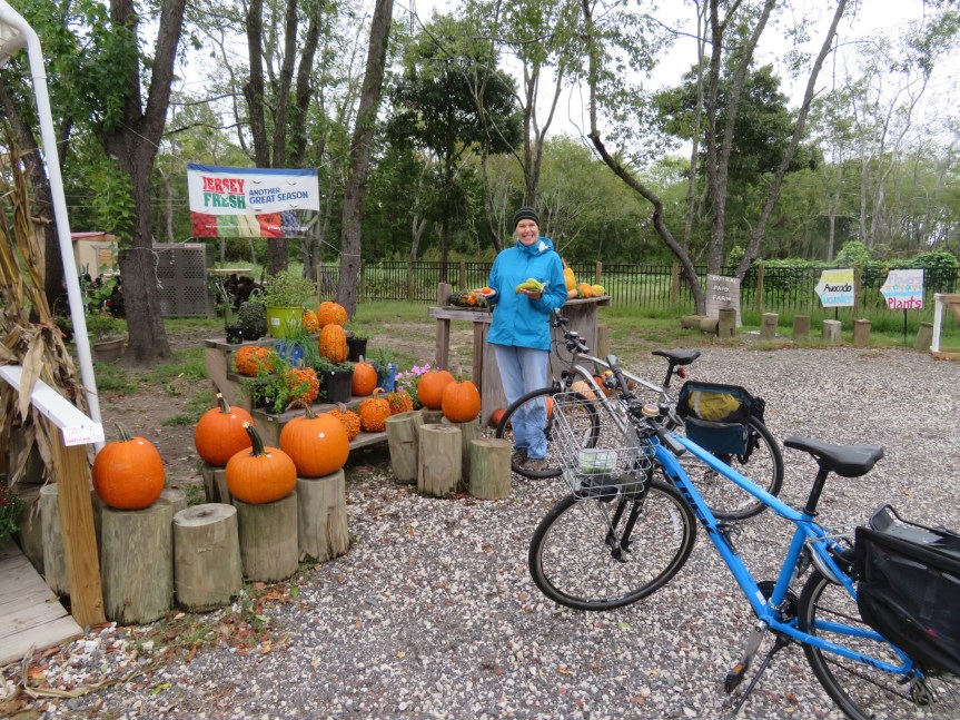 Once camp was set up and the dogs fed, we locked them inside and rode our bikes into Cape May’s tourist center. Not far from the camp, we came across a quaint farm stand with lots of fresh produce. There were no people there, they had it set up old school honor system. We picked out a variety of veggies and dropped our cash into the mail slot at the farm shed before riding on to the ocean.