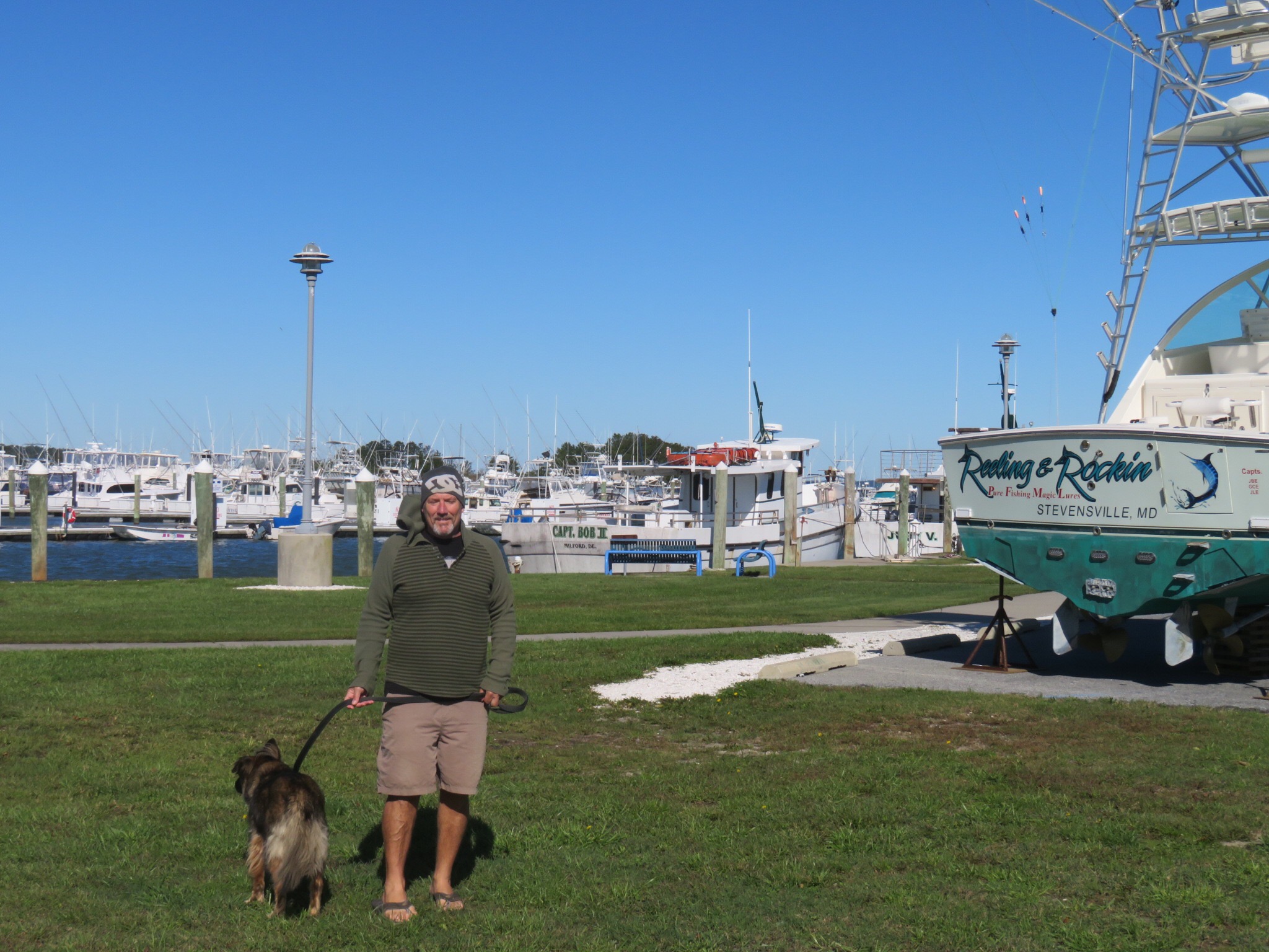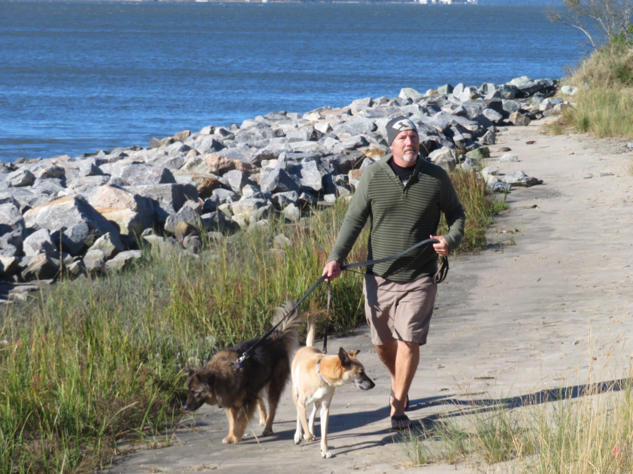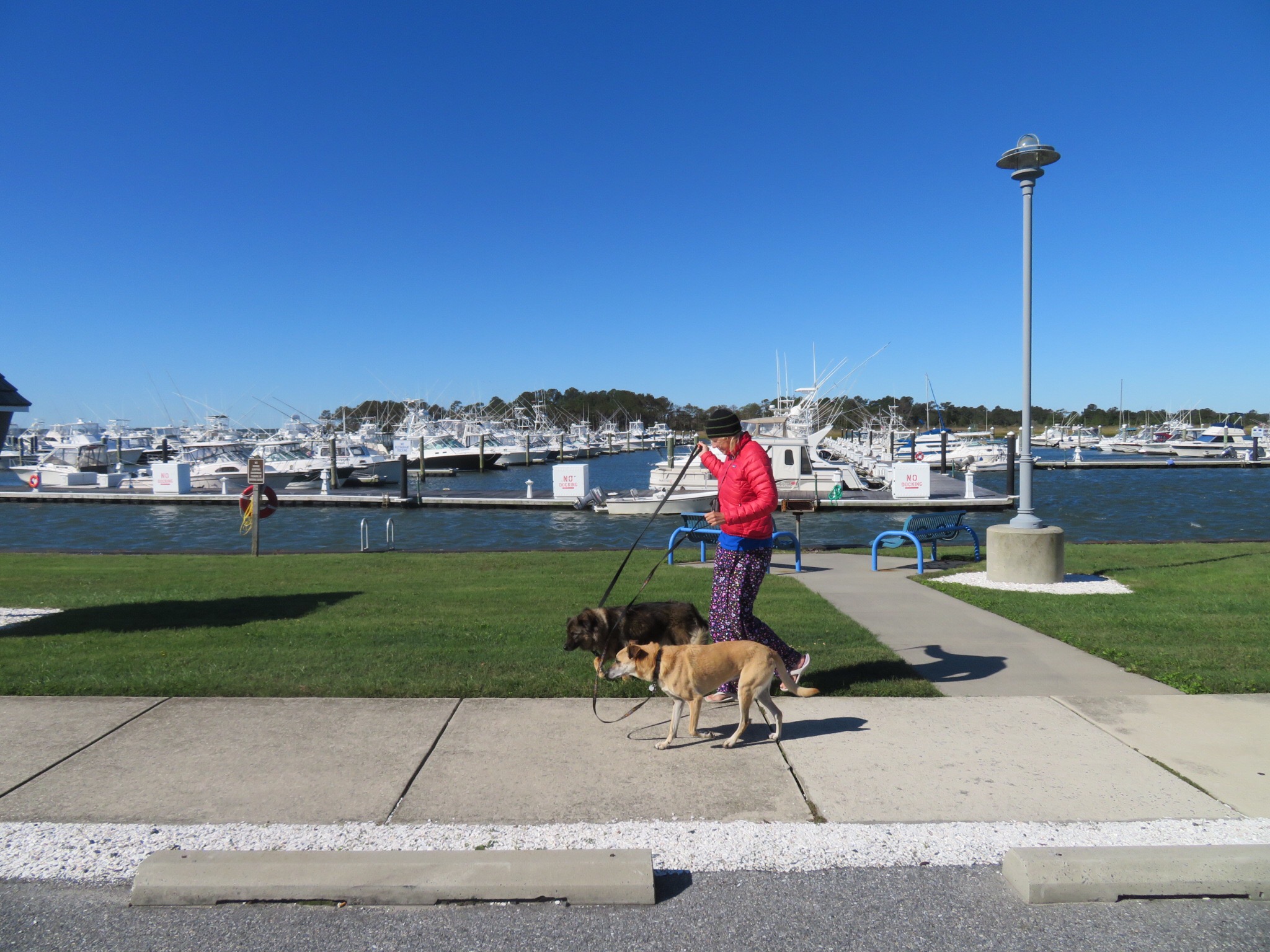 We went for a long walk behind the campground and down to the marina. As we were passing the Coast Guard station, a bookish looking fellow pointed out a yellow crowned heron situated in a juniper tree along the wetlands. I took a few photos and removed my sunglasses and hung them from my collar to better see the viewfinder. Immediately after, we crossed the street and walked down to a small sandy cove where a lone fisherman was casting his line. PJ wanted a picture, so I walked a few feet down on the sand and gave her a smile. We were just a few steps out on the sidewalk leaving when I realized my sunglasses were no longer with me. We retraced out steps and the fisherman was walking around the beach area and there were no sunglasses to be seen. Pam asked him if he’d seen them and he warily said he hadn’t. We searched a bit more in vain and then realized there was nothing we could do.