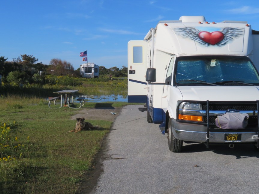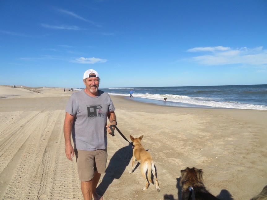 We relaxed in our watery camp site and PJ gave the dogs their cookie treats and we hung out in lawn chairs overlooking the dunes. My back is still not 100% so I took it inside and nursed it a bit. An early night for these vagabonds.