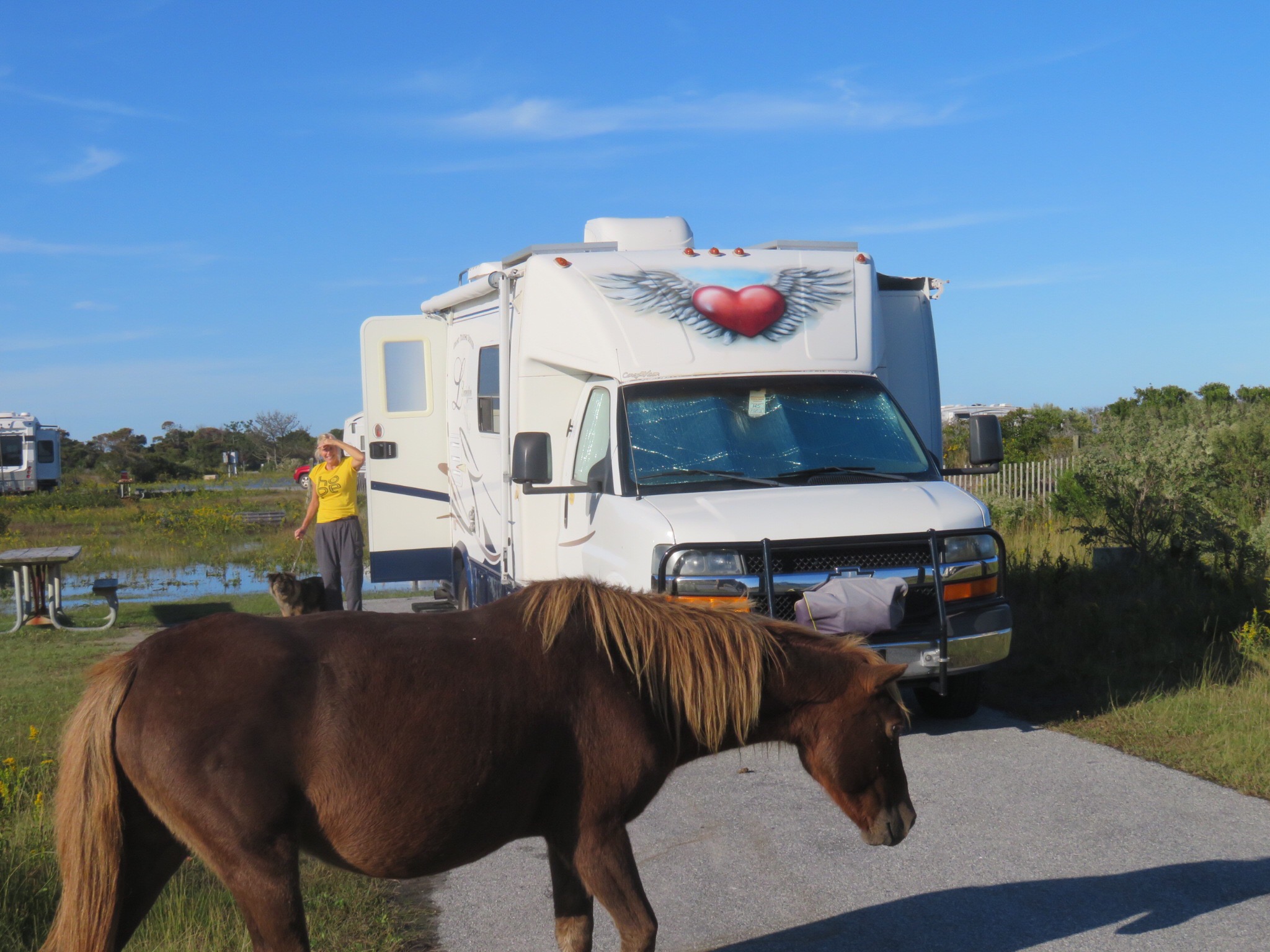 We returned and set up camp. While PJ arranged our belongings inside, I took Cali for a walk to check out the bath house. I never made it there. In the lane next to ours, there were a pair of wild ponies grazing next to someone’s camp. I grabbed the camera and took a few pictures. When I got back to our spot, we saw another pony raiding someone’s camp and they were fending him off with a broom. The pony came over our direction and strolled right through our camp.