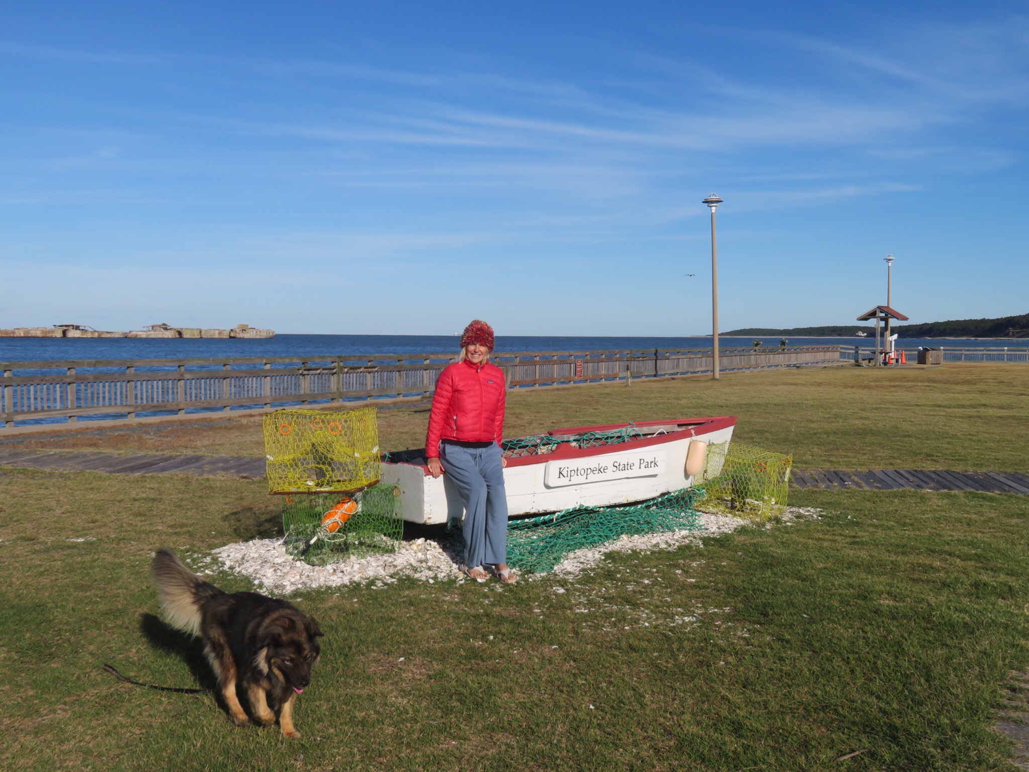 At the end of the grassy park area lies the rickety wooden steps to the northern beach where dogs are allowed. The water was calm and both dogs got their feet wet. Koda was starting to tire so we headed back to camp and had a bit of breakfast and sat on the grass in the sun reading the paper and watching weekend campers arriving and setting up their spots.