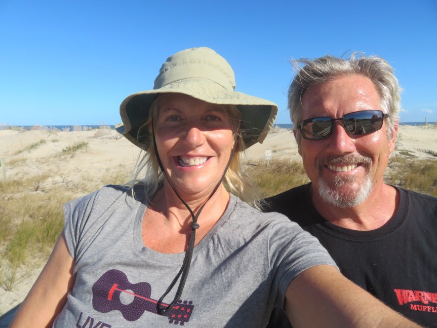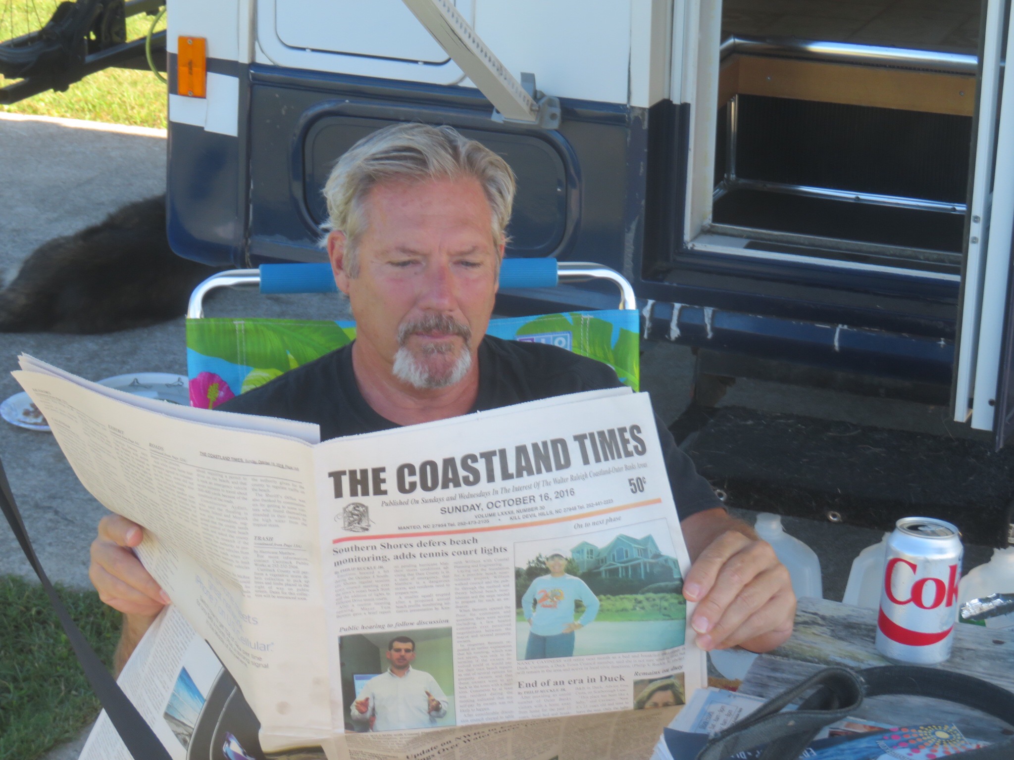 We took it easy on Sunday. Lots of hanging on the patio reading newspapers and watching people come and go. We have a campsite in the middle of everyone. About 8 empty sites between the neighbor on each side. Nice and private. I took the dogs for a walk on the beach to start the day. Carried my little cup of tea and enjoyed slowly strolling along the sand. Weather was perfect mid-seventies with an ocean breeze.