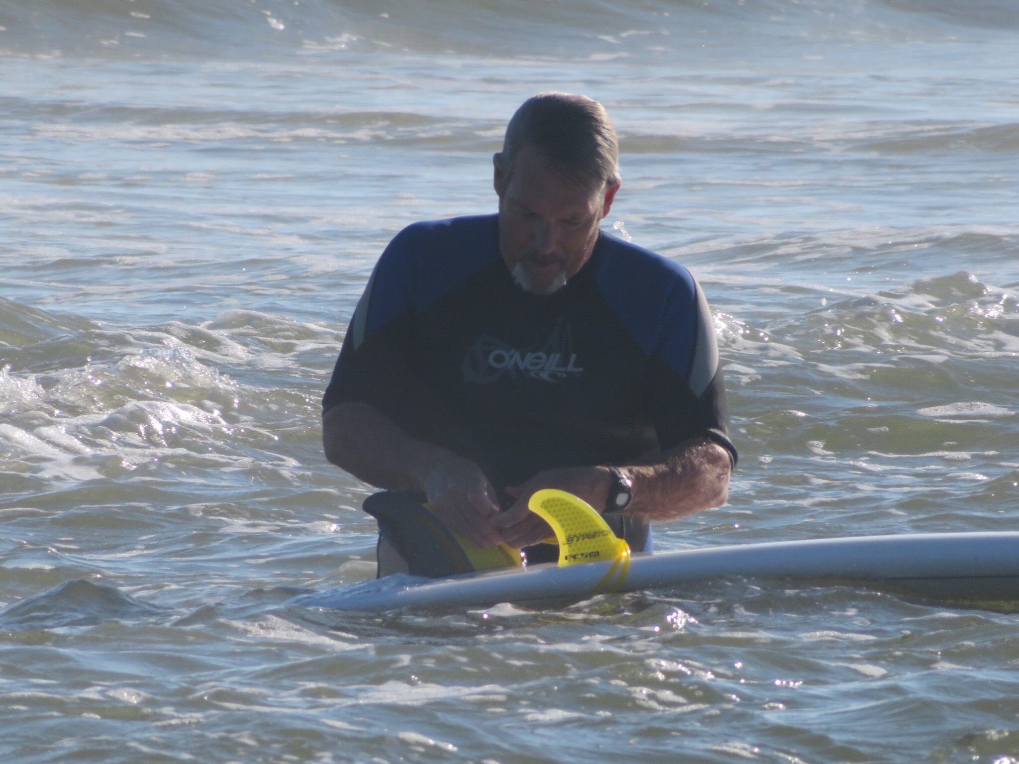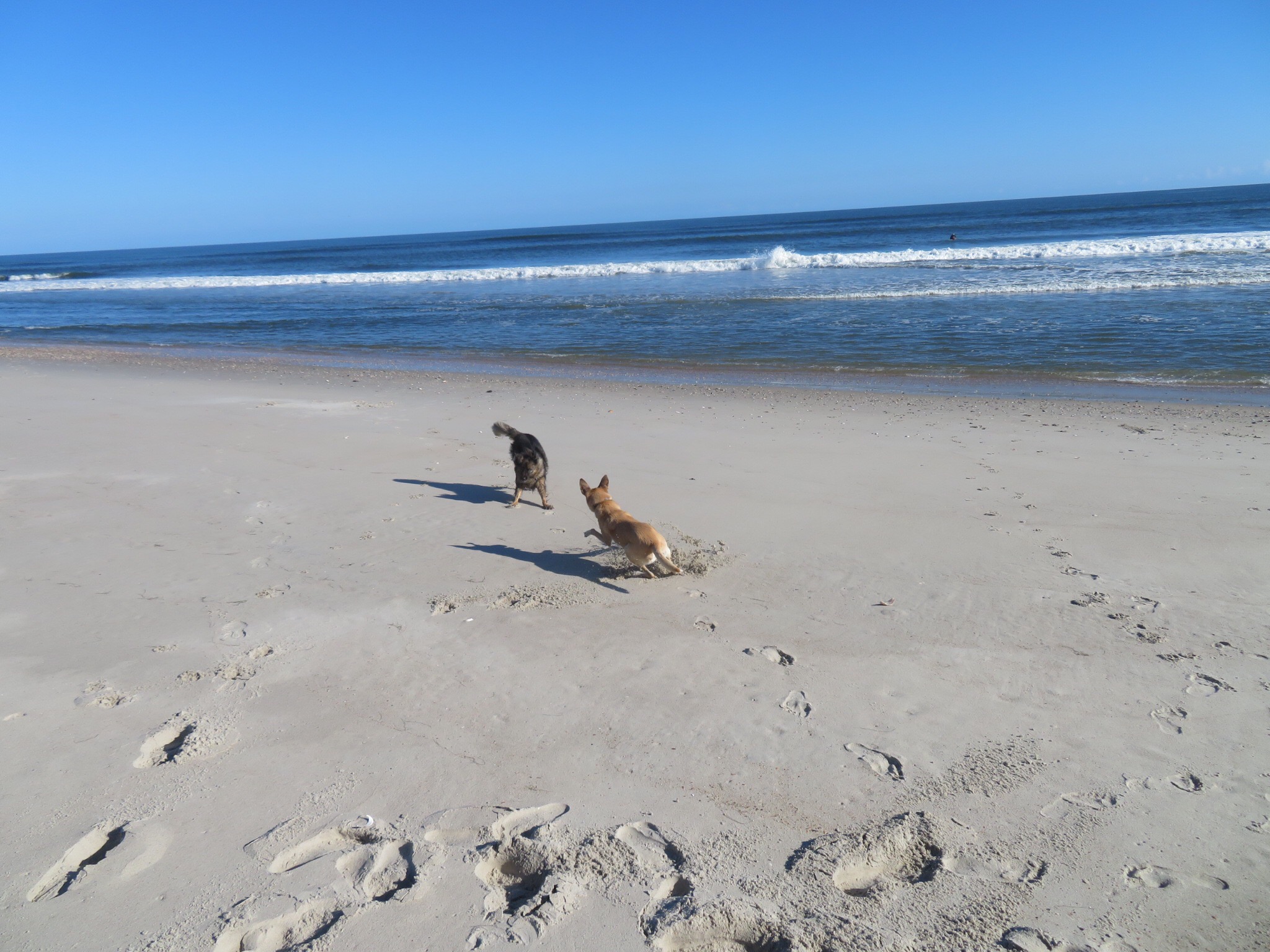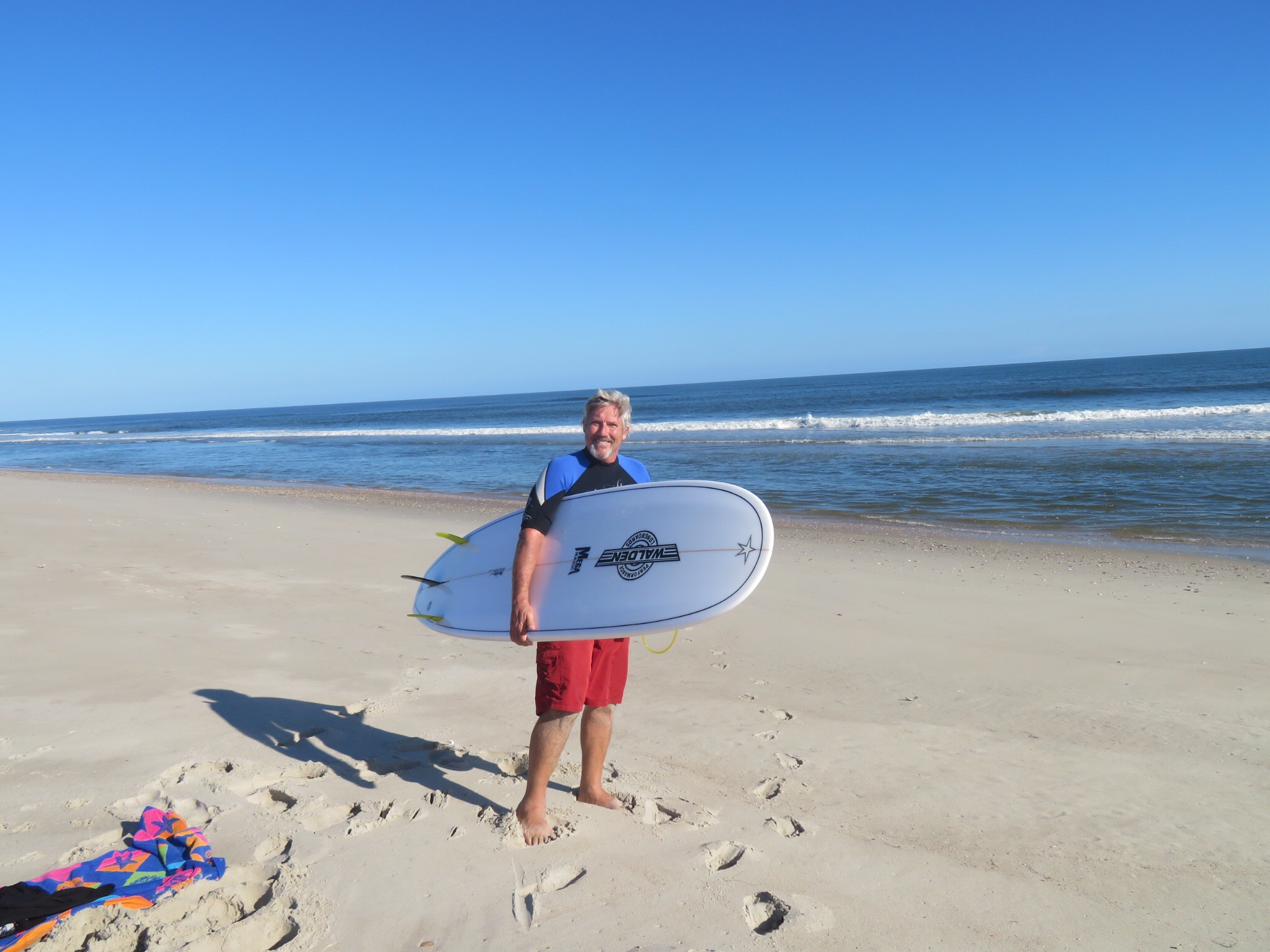 It was close to 3:30 when we disembarked on Ocracoke. We drove a few miles down the road then found a beach parking lot and pulled in. The waves were a bit smaller on Ocracoke, but the sun was shining, the water is 74 degrees and I have a new board so I paddled out for a short session just to see how things feel. PJ called her sister to wish her a happy birthday while I was in the water.