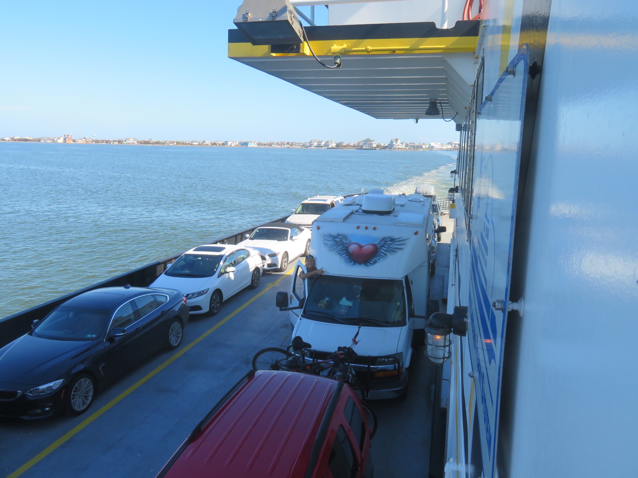 The ferry to Ocracoke is free as part of NC-12. There were about six cars already there when we pulled in and several more lined up in the 15 minutes or so that we were waiting for the boat to arrive. You all know how I love cars on boats. The ferry took about an hour. They sail about twice as far as the crow would fly weaving and turning in a zig zag fashion to avoid all of the sand bars and shallows that are in the channel. The sun was shining and it was high 70s. Beautiful day to be out on the sea.