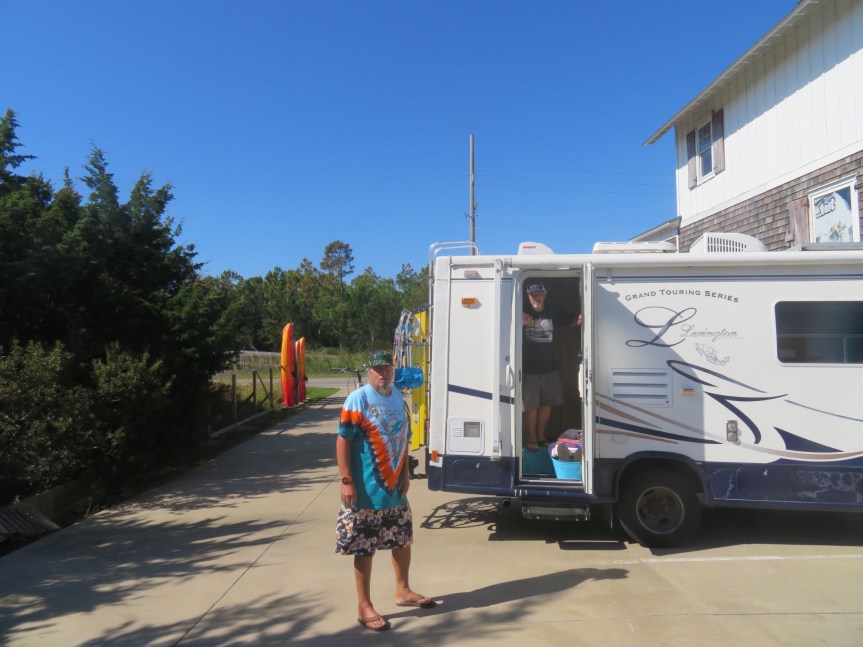 I woke early and took the dogs down to the beach for their last Hatteras walk. We were packed and out the gate right at 11:00. We went down to DVO and negotiated for a while with H.T., the sales guy we spoke to yesterday. He was in trouble with the owners for giving me a price that was lower than what they actually paid for the board themselves, but said they’d honor it anyway. Grabbed a leash, got set up with some fins and gave H.T. a tour of the motor home. Talked awhile in the car park, then said good bye and headed down the island to the ferry.