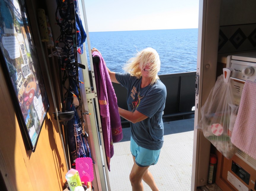 The ferry passengers were few and we loaded quickly and easily, maybe a third of the boat’s capacity. This was a two hour and fifteen minute crossing to get us back on the mainland and heading south along the Atlantic coast. The dogs even went out on deck for this ride. We relaxed in Lexi most of the trip, made lunch and napped.