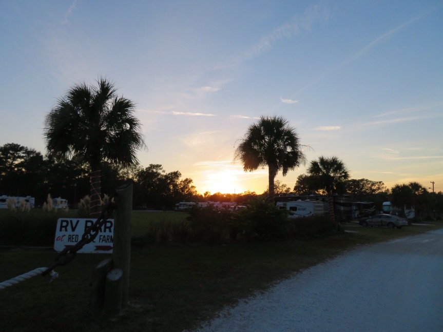 The poor dogs have picked up a stomach bug and they both had to get up multiple times throughout the night with watery bowels. That combined with a bit of road noise made for a poor night’s sleep and a slow moving morning. PJ stayed in bed while I walked the dogs around the farm. The sun caressed the trees with their long tendrils of Spanish moss and the kids capered around in the goat pen under the watchful eyes of their mothers. The ducks were languidly swimming in the calm water of the pond and bold squirrels stood un afraid as the dogs walked past.