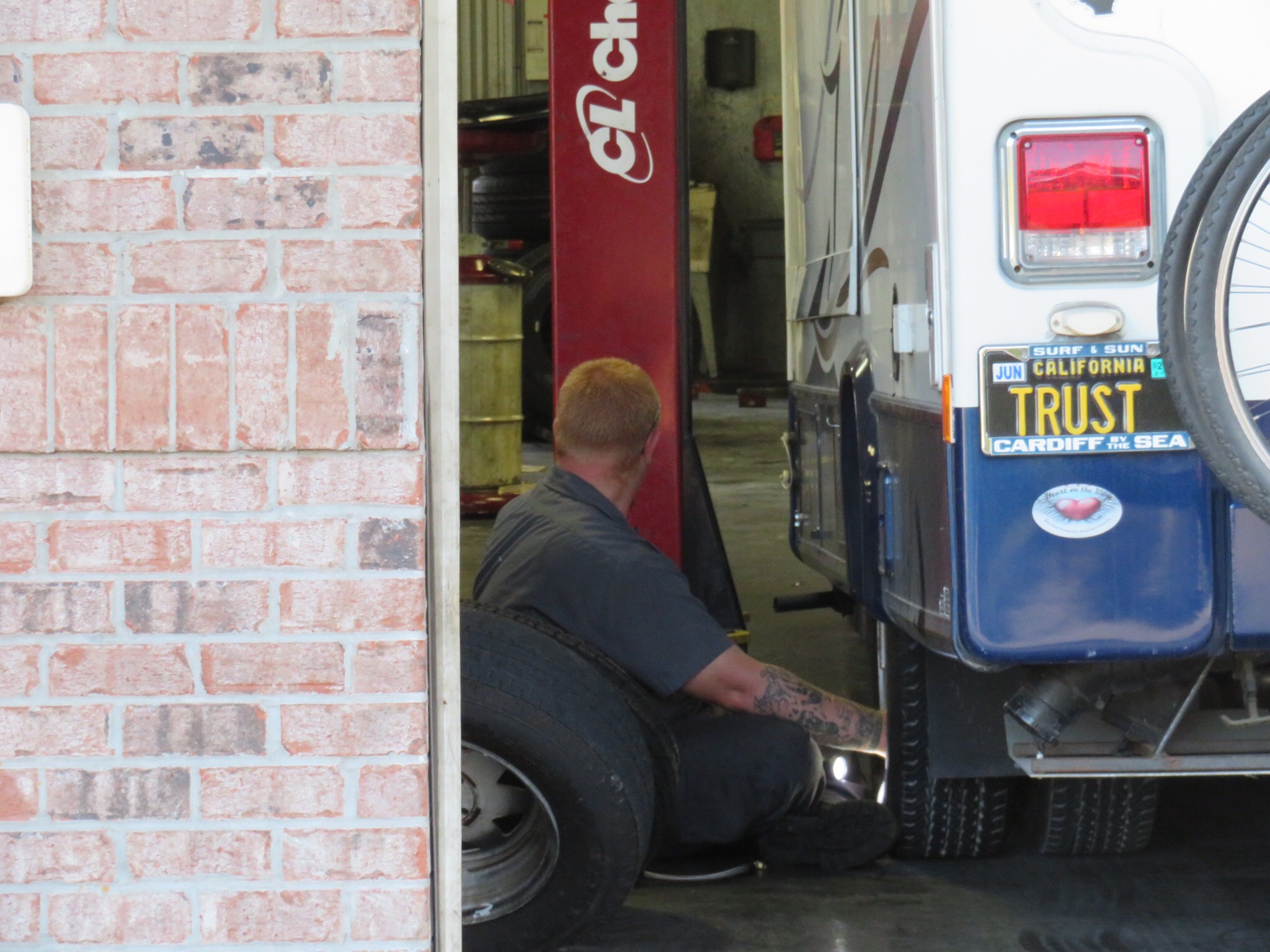 Back at camp, I tried to nap for a while and returned to the tire shop at 4:30. It has taken a few iterations of explaining which tires I’d like mounted on which rim. The end game is to hopefully have both new tires (today’s purchase and the spare from yesterday) on the outside rears and one of the older tires as a spare with the proper corresponding valves. It’s already 5:15 as I sit waiting and so far no action. They close at 6:00, so we’ll see.