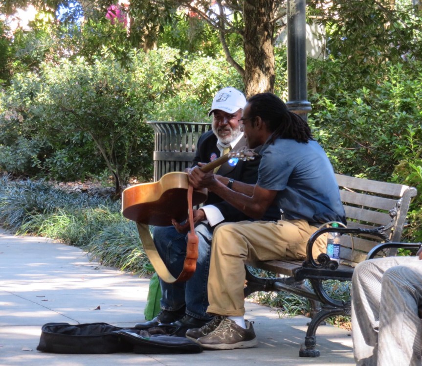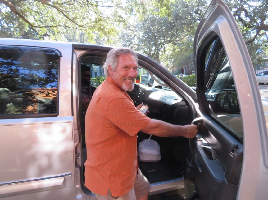 Another noisy night at the farm. Train cars clanking and slamming, highway traffic, and at around 4:30am, a mosquito spraying truck with a fogger that sounds like a mufflerless motorcycle. We fell back to sleep and arose at nine and did our morning walk around the grounds. After a quick shower, we hailed a Lyft and rode with a local lady downtown to catch a noon AA meeting near Forsyth Park. Excellent meeting with an interesting cast of characters. It was one of those meetings where you go around the circle and everyone gets to share.