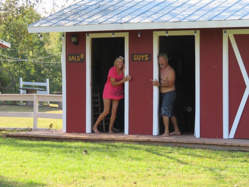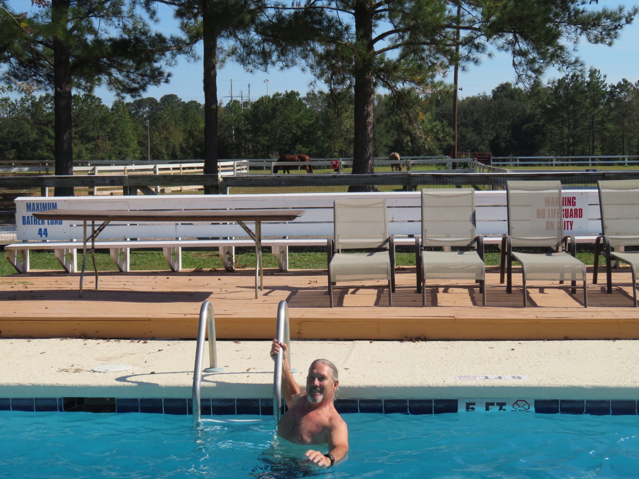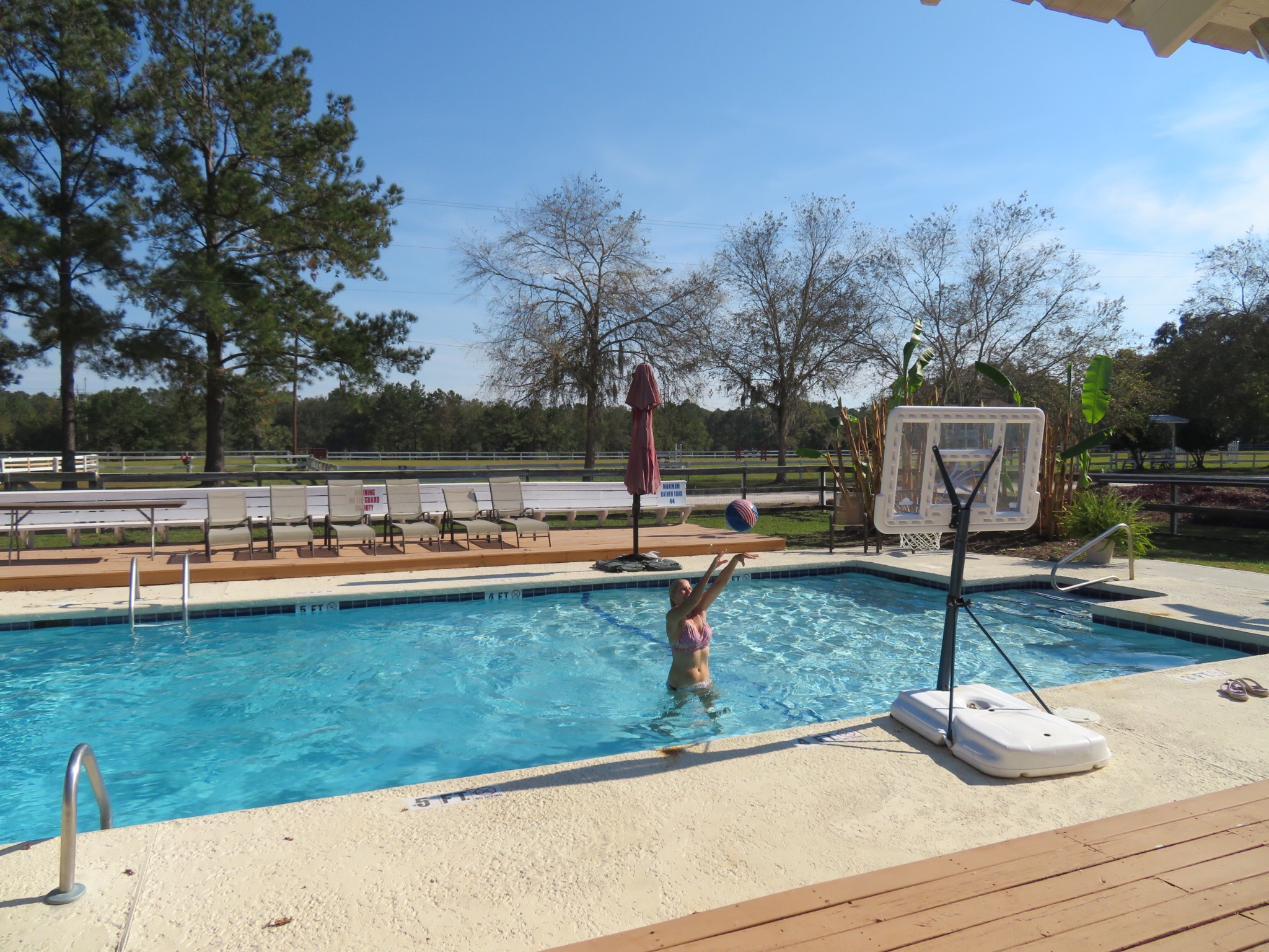 After lunch, the air was getting hot and the sun crept around to the side if the RV so we put on our swim suits and hiked down to the pool. We were the only ones there on this quiet Sunday afternoon. We swam and shots some baskets then resumed lounging under the pavilion and I devoured about half of the book I am currently reading, book four of the Game of Thrones set.