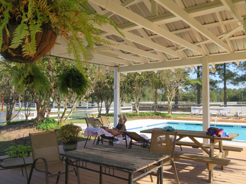 We walked around the barn area near the pool and pond where they hold weddings and other events. PJ had written off the warning signs about gators as a joke until she actually spotted this little character poking his head up in the middle of the pond.