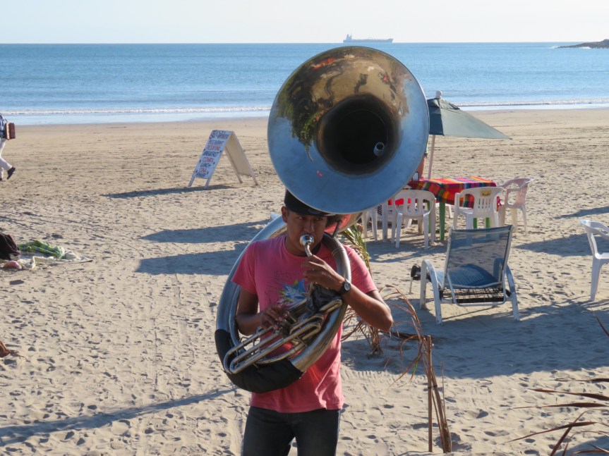 We ordered up some lunch and relaxed while watching the locals come and go. There were lots of vendors and strolling musicians vying for your dollars. We listened as a three piece band serenaded the large party of Mexicans having a family get together at the table next to us. A group of men were drinking Ballenas and playing dominoes at the rear of the restaurant while some older gringos were negotiating a price for a pair of ceramic bowls from a young girl wearing a traditional shawl.