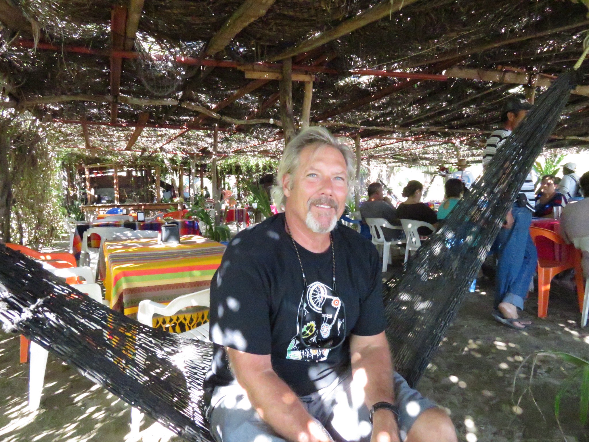 Hammocks were randomly spread about under the large thatched area. Things were unhurried and we fell into a peaceful rhythm moving to the hammocks and back to the table when our food arrived. Garlic shrimp for me and a quesadilla plate for PJ.