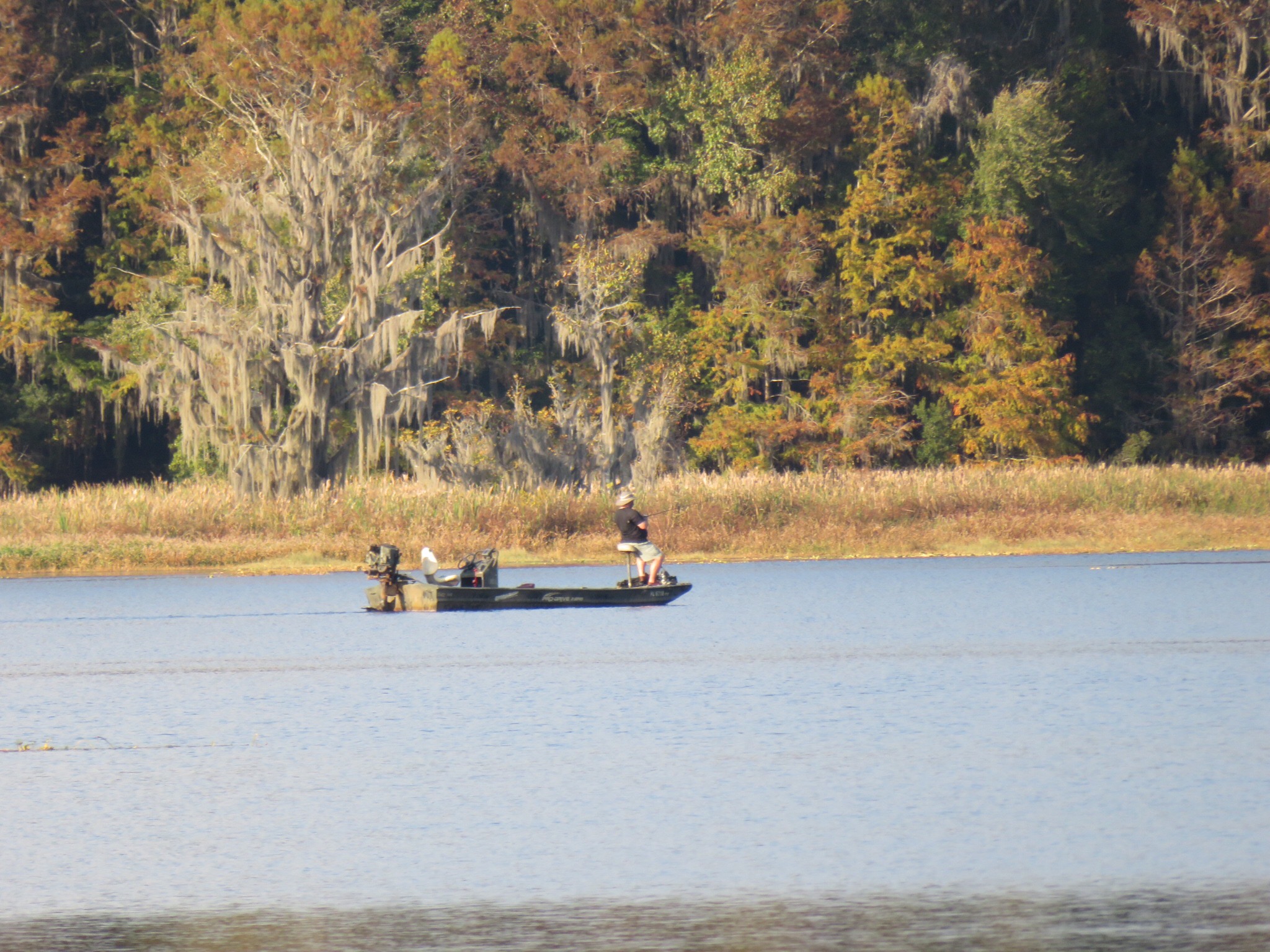 The sinking sun was playing games backlighting the hanging moss on the trees surrounding the camp. We met the camp host, Rusty and his big Great Dane, Bogart. Cooked up some dinner and ate it while admiring the view out the RV window. A rowboat shot past with the boatman leaning hard into his oars and holding a fast pace with a perfect rhythm heading back to the boat launch area. The older couple from next door walked hand in hand down the wooden steps to watch the day fade away from the end of the dock.