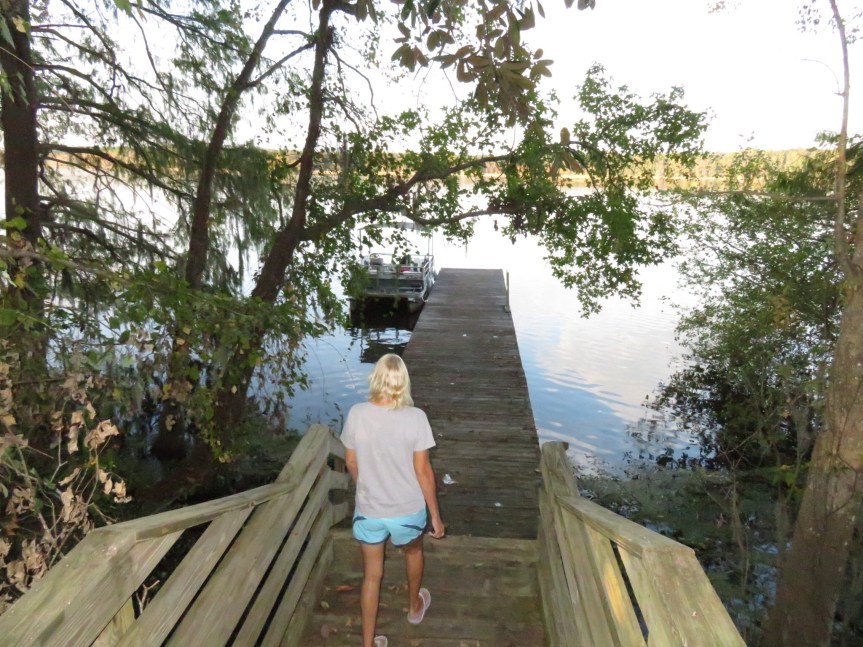 We got ourselves set up, fed the hounds then took a walk around. We are right next to the little boat dock, a rustic pier made of wooden planks with no railings to speak of. A few smaller boats were out fishing the swampy looking waters. Any aspirations I’d had of going for a swim quickly evaporated when I got down and saw the overgrown vegetation along the banks of the lake. Perfect alligator habitat. Sorry, Koda but you’re staying on the leash.