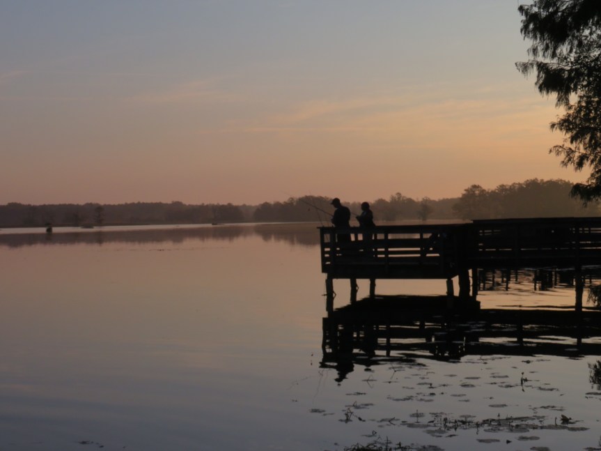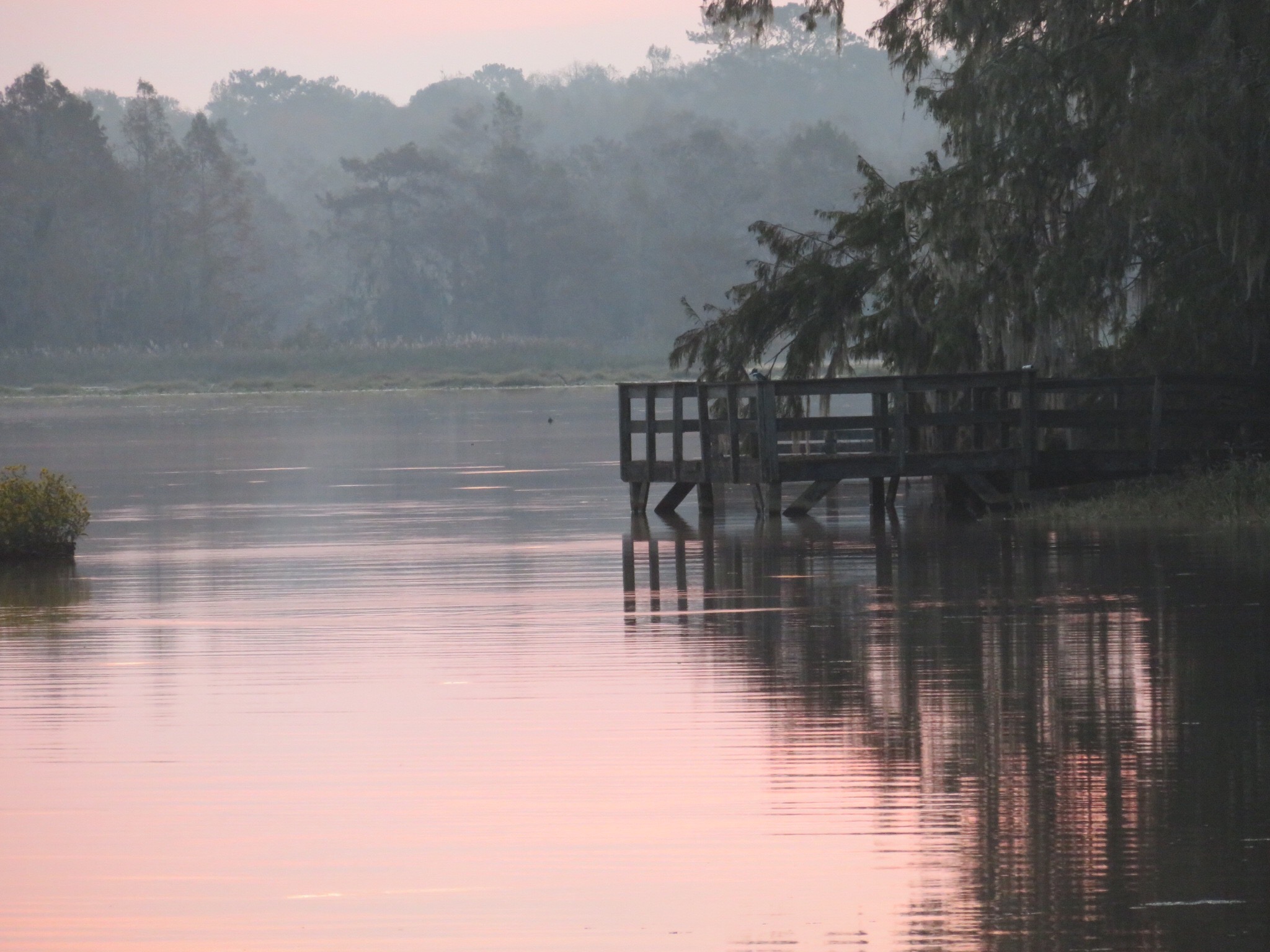 The night’s slumber was interrupted by one of the dogs having issues and needing to go out for a 3:00 a.m. walk. Afterwards, sleep came difficultly and I lay listening to the sounds of the forest for a long while. Nevertheless, I was awake at the crack of dawn and walked out on the dock to watch the sunrise over the water.
