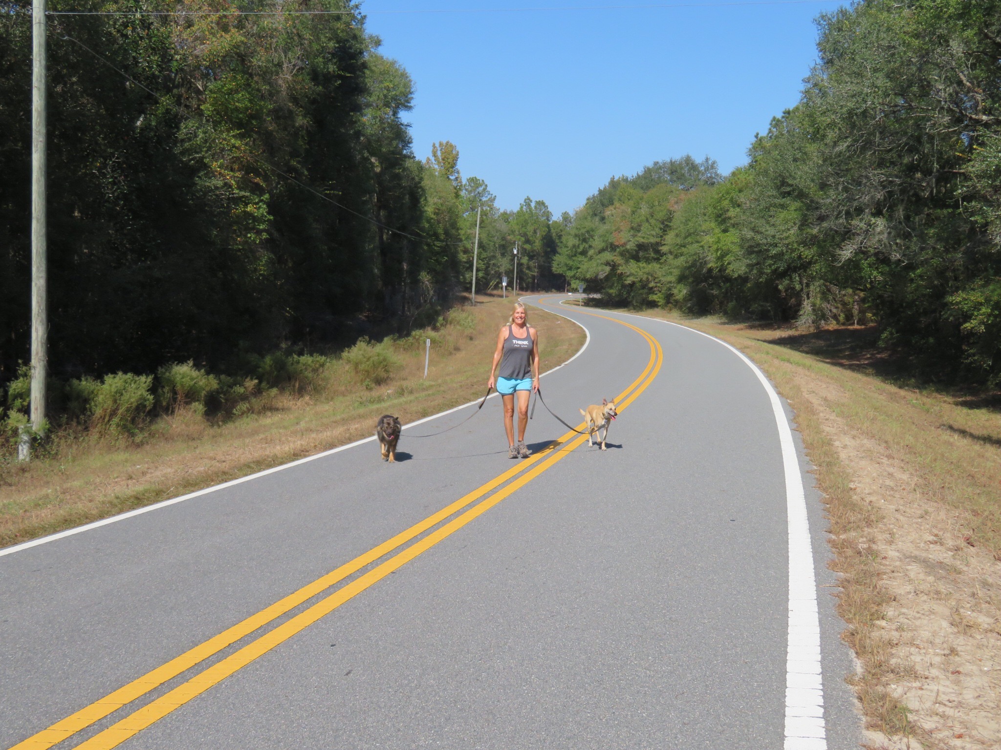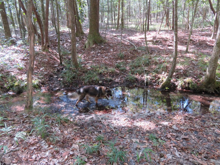After carbo loading on peanut butter sandwiches, we hiked up the road where we found an almost imperceptible little opening into the state forest on the west side of the street leading back to the highway. Koda finally got a chance to get her paws wet in the small creek at the bottom of the trail. It was a long hot outing. We walked about five miles in the midday sun, down the asphalt, through a dirt road and then into the woods. Pretty country, but next time we’ll be sure to bring the Off. The mosquitoes were a little thick down in the canyon.