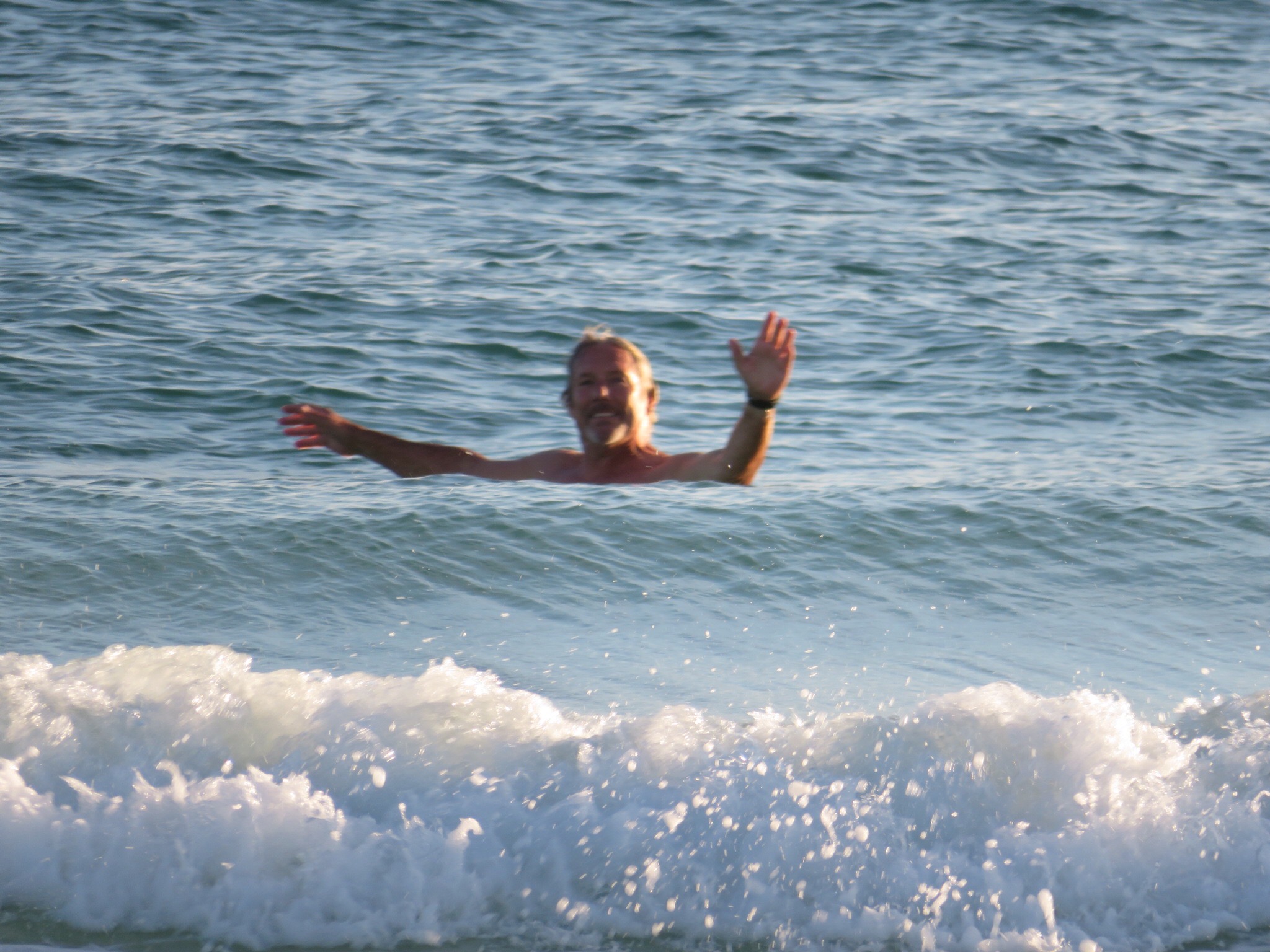 We gained an hour coming west, but it was still close to sundown when we took the ten minute walk over to the beach. Brilliant white sand and emerald green, crystal clear water. They had the purple flag up warning of a wildlife hazard, but we didn’t know what the danger was. Shark, jelly fish, sting ray? Nobody was swimming, but we couldn’t resist. The 77 degree water was refreshing but easy to get into. Felt fantastic to rinse off the road fatigue.