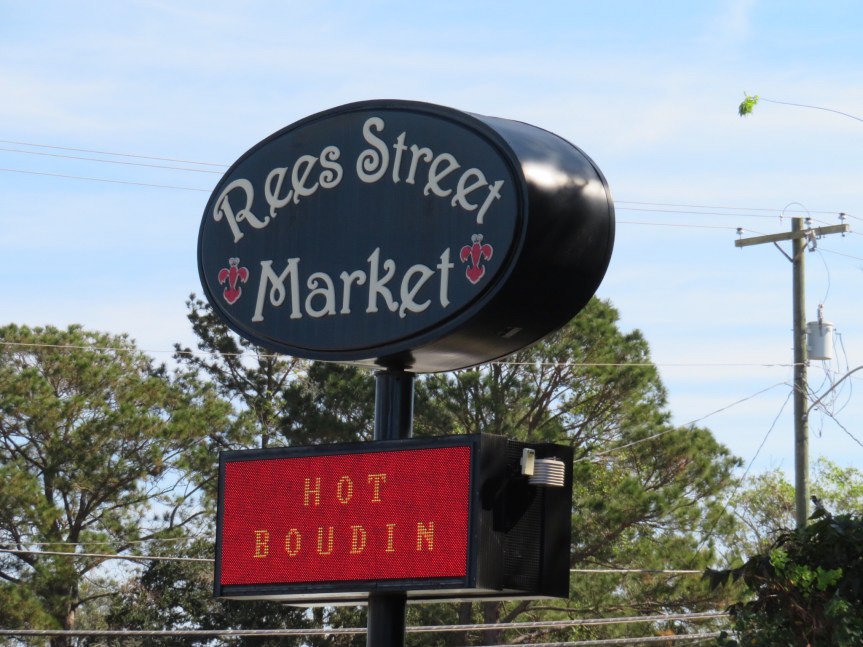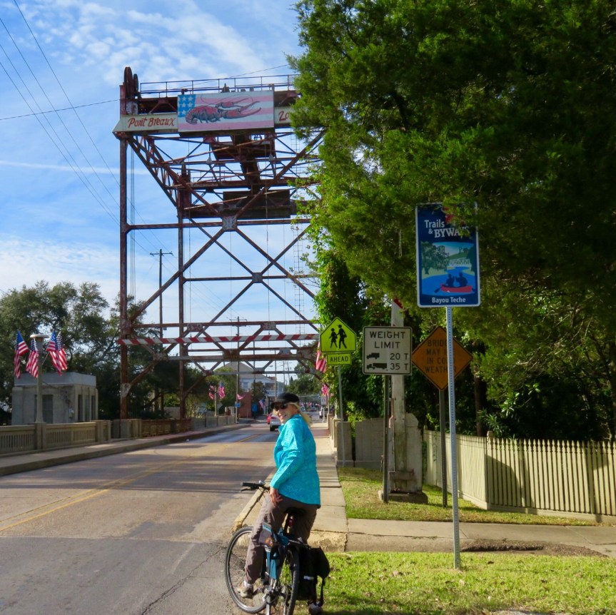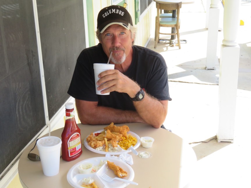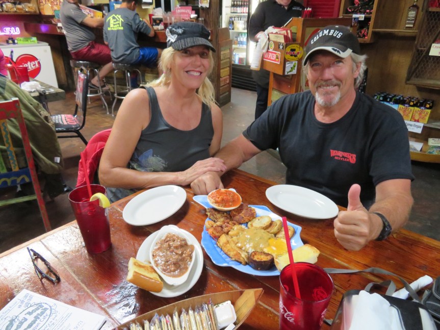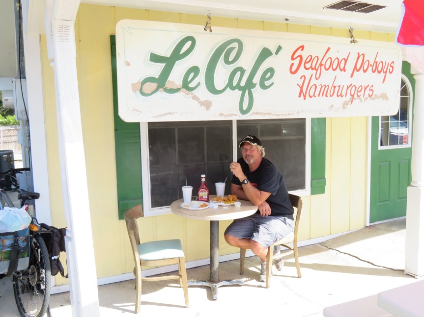 By now, it was after 11:00 and we still hadn’t found any place to get any sustenance. Anyone that knows me, can tell you that leaving me hungry is not a safe practice. We rode over to the Rees St. Market and got some groceries figuring to just go back to the RV and make some breakfast. On the way home, we came across a little shack cafe offering po’ boys and fried catfish. Not the etouffee I was hoping for, but it wasn’t bad for an early lunch. We split a large order of fried catfish, shrimp and fries while sitting outside in the shade. With our baskets and panniers loaded with groceries, we rode the bikes on back to the campground and organized the motor home.