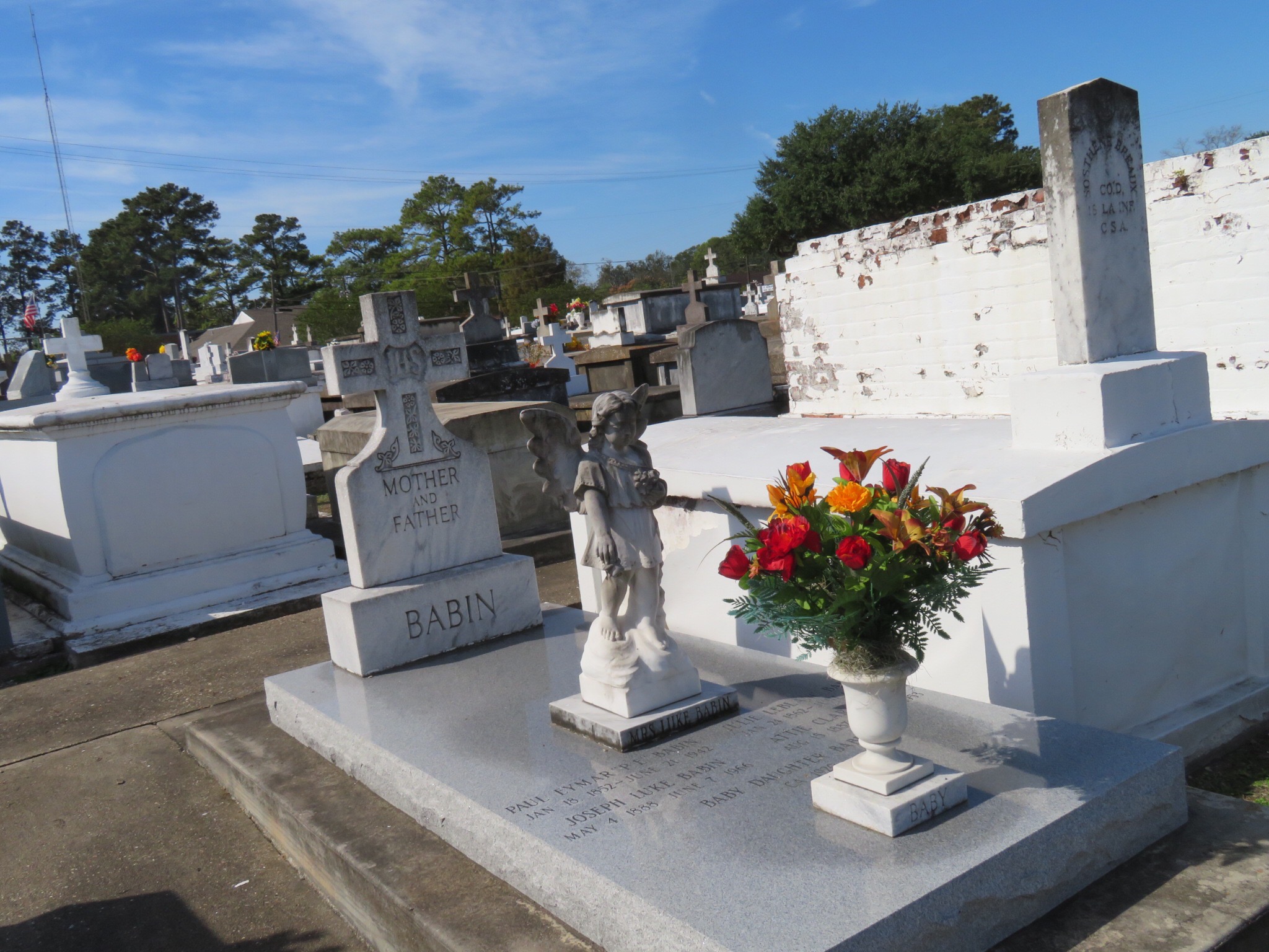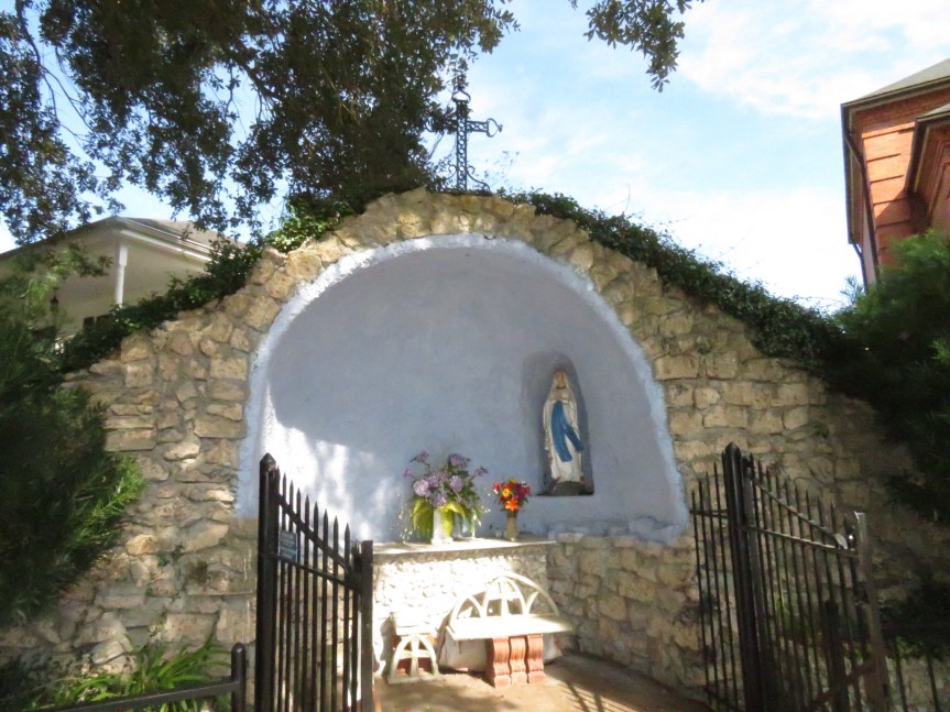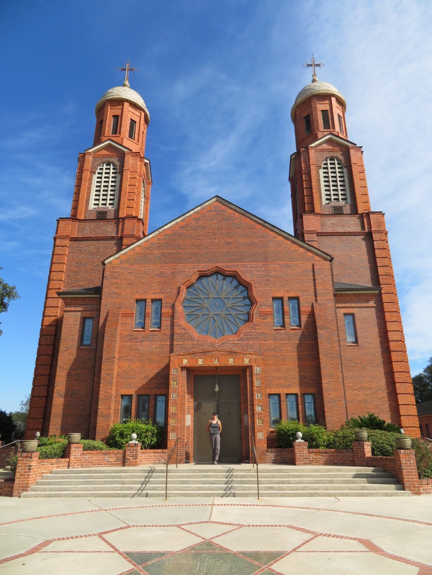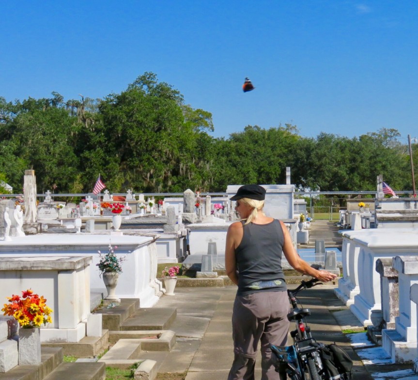 Pam wanted to go back to another antique store she had seen over near Cafe des Amis. I wandered over to St. Bernard’s Catholic Church across the street and had a few quiet moments at the grotto for Santa Maria. The parish had been recently restored and it was a beautiful bit of architecture. Home of the first St. Martin native to be a priest, Fr. Jeanmard. He later became a bishop for the area. PJ returned and we toured around the grounds and checked out the adjacent cemetery. The church was built in 1848 and many of the graves were from that era and earlier. Lots of Rousseaus, Heberts, Guidrys and Breauxs. And butterflies. One followed PJ as she walked among the tombs in the graveyard. The spirit of one long ago passed?