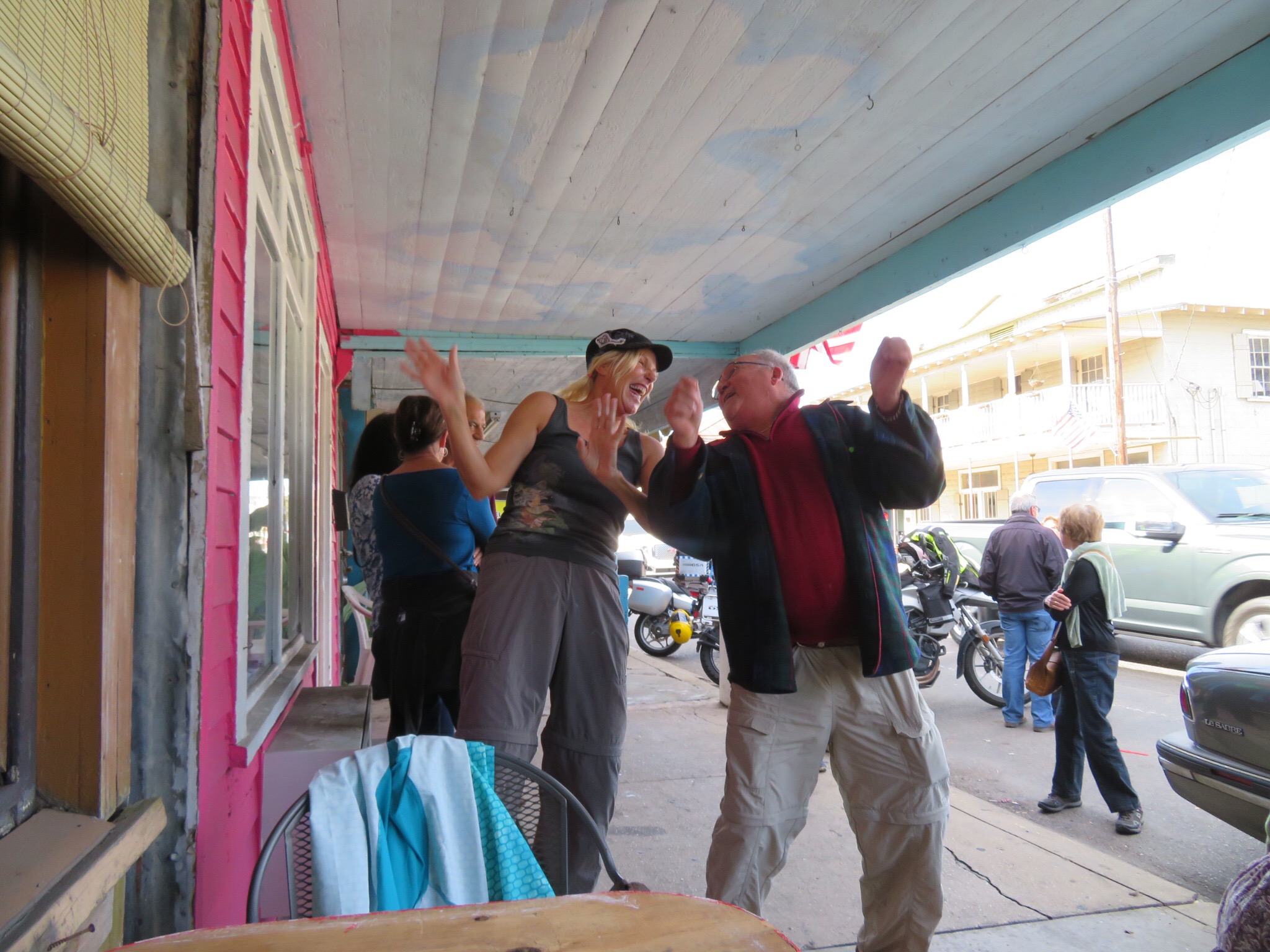A solo woman was singing and playing an organ at Chez Jaqueline and the placed was packed. We found a patio table and staked out a spot. The staff were overwhelmed by the large overflow of customers they received due to Cafe des Amis being closed. Understanding this, we waited patiently for the waiter to at least swing by for a coffee order and maybe drop off a menu. Meanwhile, a few people were dancing and PJ joined in the festive activity. After about 25 minutes, I caught the waiter and asked to order. He said it would be an hour and a half before we would see any food. He was a nice kid and totally apologetic, but that was a little longer than I was willing to wait. At least we got in a dance or two.