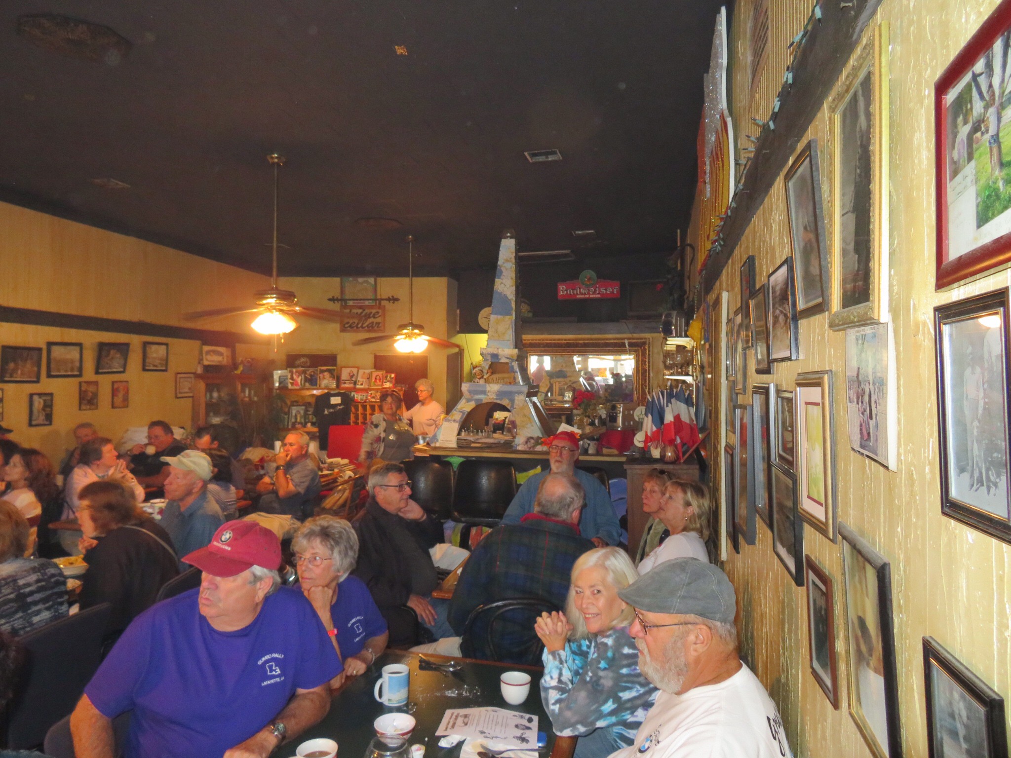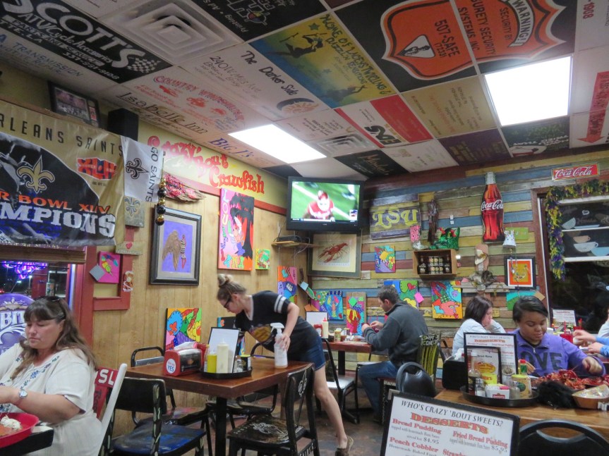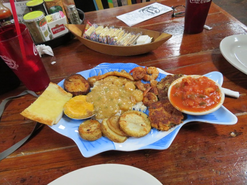 Many of the customers had huge trays of boiled crawfish and were doing their best to finish the generous portions. The LSU game was playing on the t.v. and we were goofing off taking a million pictures. The staff was super friendly and soon our platter arrived. We had to ask what some of the items were. Rather than roll her eyes, the waitress was happy to explain what each morsel was. Gator bits, crab cake, crawfish cake, crawfish boulette, crawfish maque choux, and a couple of other things I’m not sure of. I did recognize the catfish, shrimp and gumbo though. Everything was excellent. The red beans and rice were out of this world. Glad we decided to share because we were stuffed by the time we walked out of the restaurant.