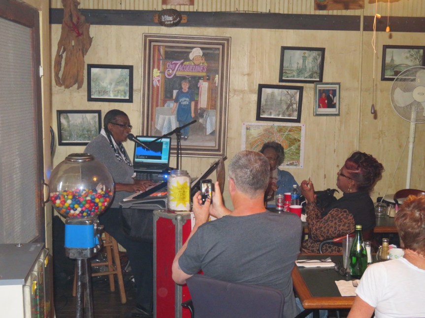 We hopped back on the bikes and rode a few blocks and PJ checked out a big antique emporium while I held down a bench outside. Next door was another little Cajun restaurant with a few open tables. Alright, finally I’ll be getting some breakfast. Musicians were piling in and tuning up their instruments. Live breakfast music seems the norm down in St. Martin Parish. We ask if it’s o.k. to seat ourselves and the young gentleman informs us that the large party of 10 hasn’t even gotten their drinks yet and that it would be at least an hour before any vittles would be making their way to our table. Fail number three.