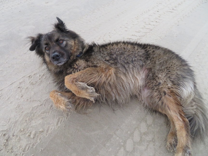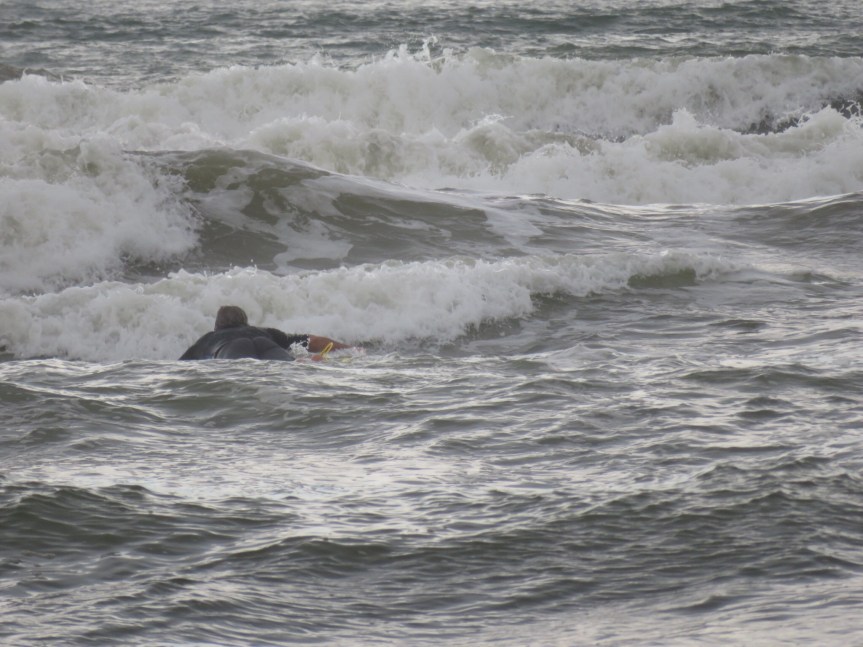 I put the dogs away, then broke out the surfboard and paddled around in the wind chop. Can’t really say I caught any waves. The current had me about half way to Louisiana by the time I cleared the never ending wind swells. It was good exercise and I walked back up the beach feeling better than before paddling out.